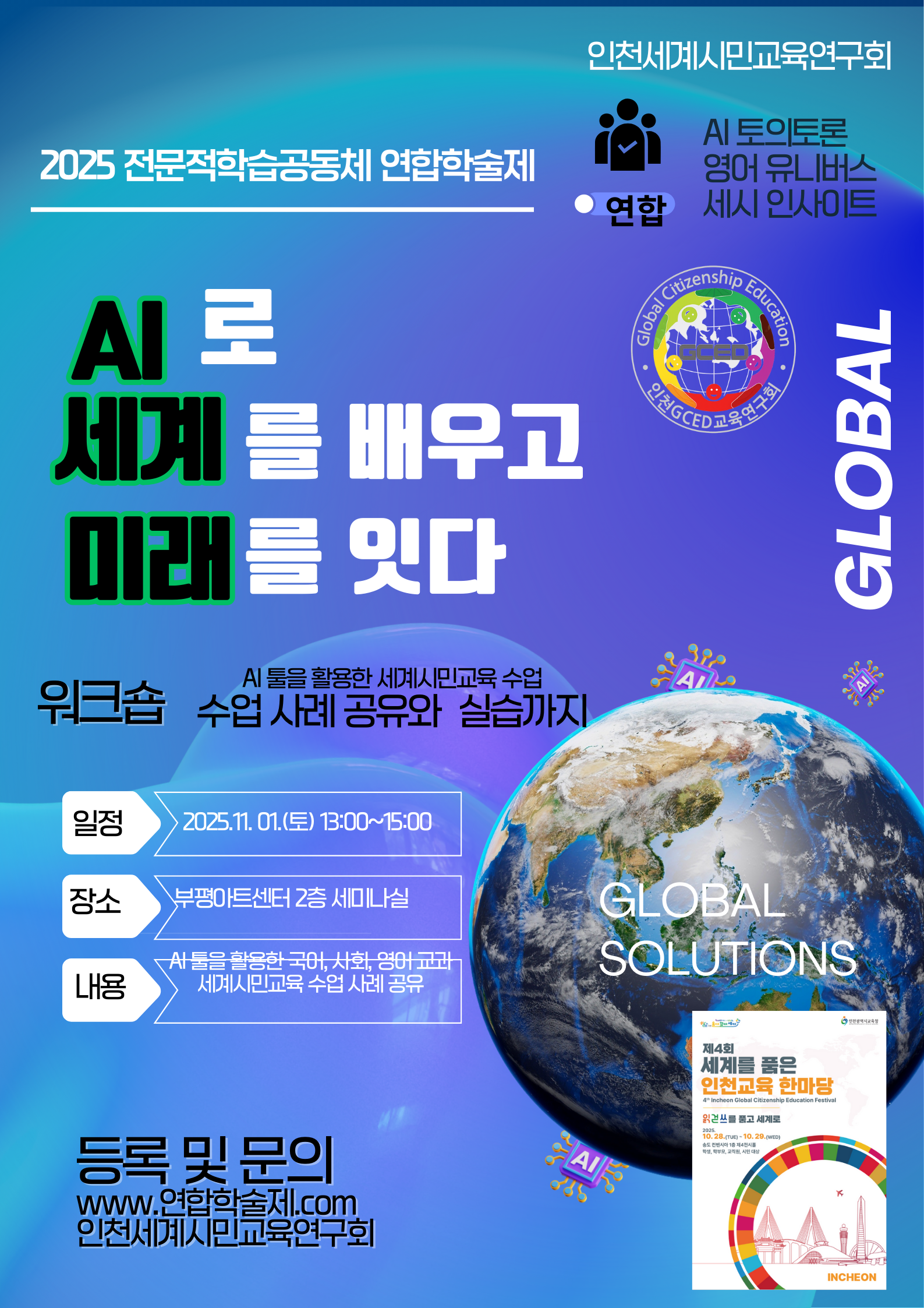 연합팀 인문/사회 부평구 AI 툴을 활용한 세계시민교육 수업사례 공유 및 수업 디자인 실습 공동체명AI토(의)토(론), AI유니버스 영어연구회, 세시인사이트 일시2025년 11월 01일 13:00~15:00 장소부평아트센터 2층 세미나실 좌석21석 / 40석 나눔방법워크숍(대면) 담당자인천서창중 서현아 신청기간 마감 목록보기