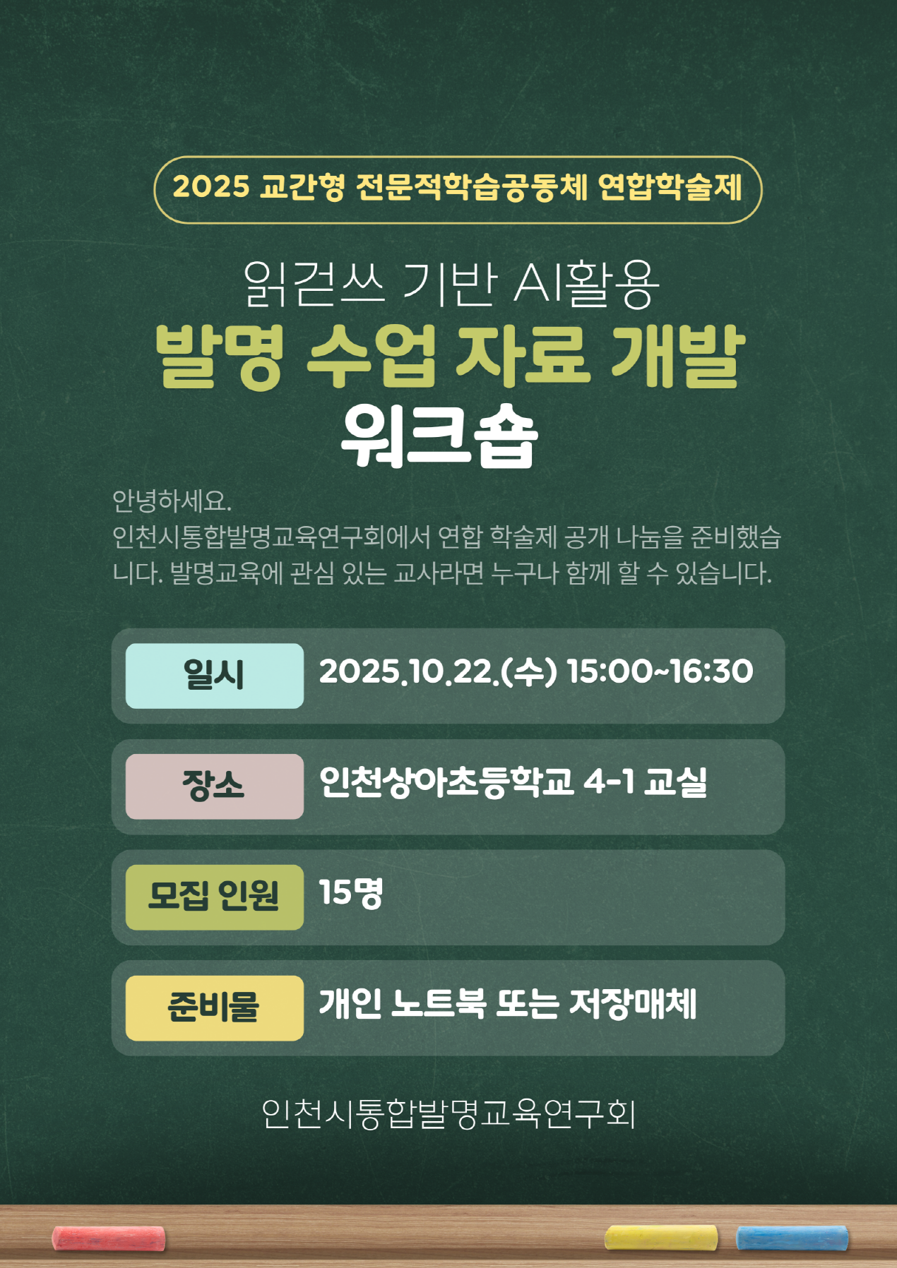 주제연구형 과학 남동구 읽걷쓰 기반 AI 활용 발명 수업을 위한 자료 개발 워크숍 공동체명인천시통합발명교육연구회 일시2025년 10월 22일 15:00 - 16:30 장소인천상아초 4-1교실 좌석4석 / 30석 나눔방법워크숍(대면) 담당자인천상아초 김새롬 신청기간 마감 목록보기