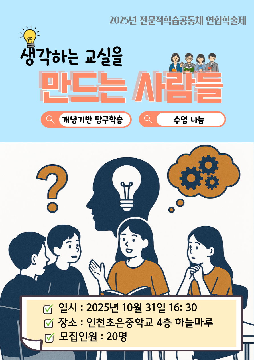 주제연구형 교육과정(IB 등) 서구 개념기반 탐구학습 수업 나눔 공동체명생각하는 교실을 만드는 사람들 일시2025년 10월 31일 16:30 - 17:30 장소인천초은중 4층 하늘마루 좌석19석 / 20석 나눔방법수업나눔(대면) 담당자인천초은중 김혜림 신청기간 마감 목록보기