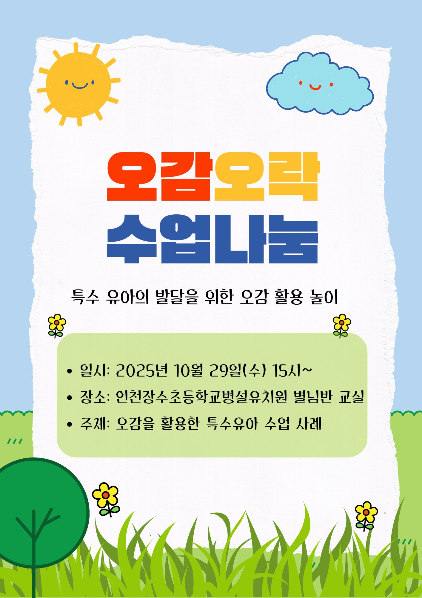 주제연구형 놀이교육 남동구 특수유아의 발달을 위한 오감놀이 공동체명오감오락 일시2025년 10월 29일 15:00 - 16:30 장소인천장수초병설유치원 별님반 교실 좌석23석 / 30석 나눔방법수업나눔(대면) 담당자인천장수초병설유치원 이윤주 신청기간 마감 목록보기