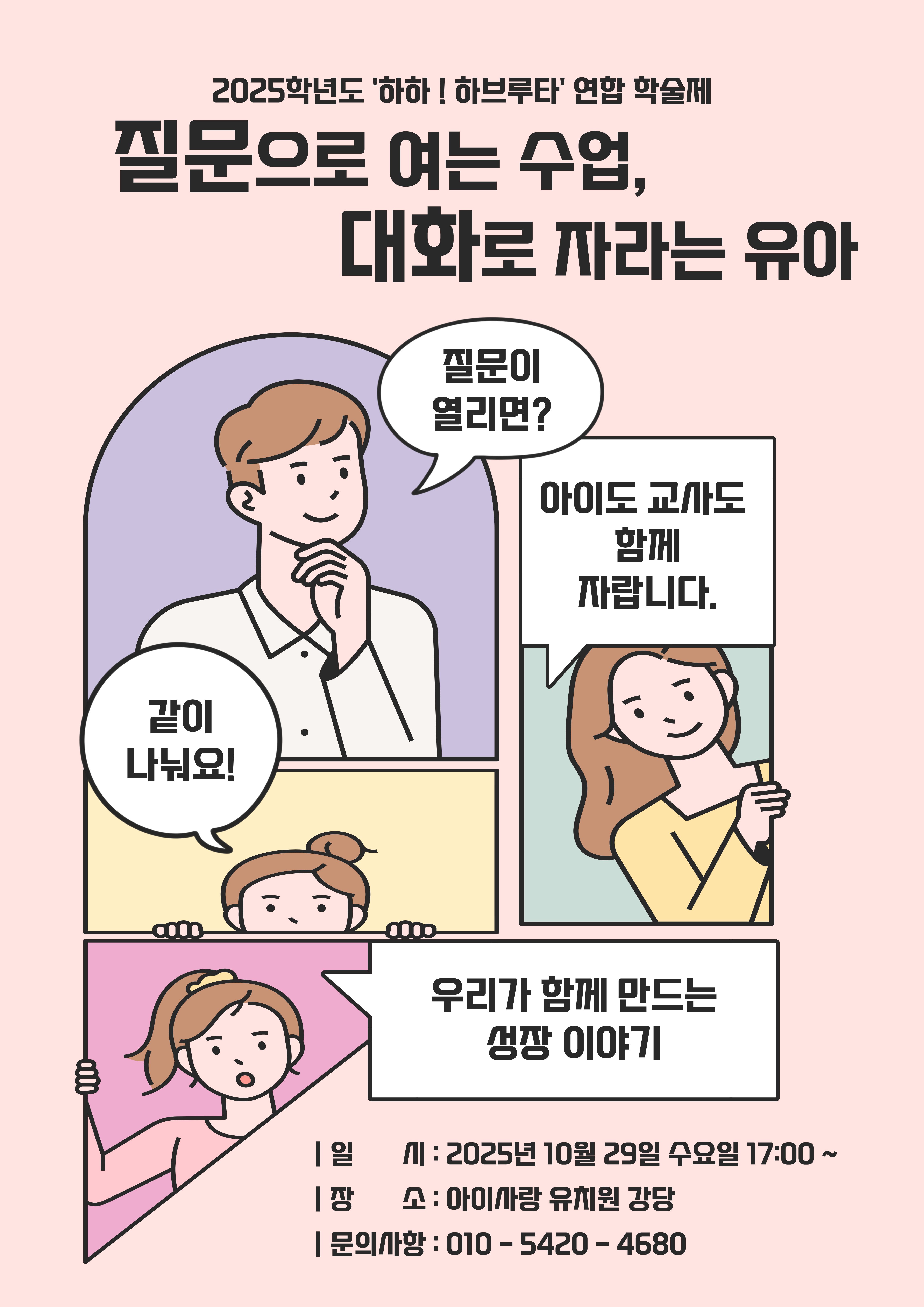 주제연구형 놀이교육 서구 질문으로 여는 수업, 대화로 자라는 유아 공동체명하하!하브루타 일시2025년 10월 29일 17:00 - 18:30 장소인천 아이사랑유치원 4층 강당 좌석15석 / 20석 나눔방법공개연수 (대면) 담당자인천아이사랑유치원 백다은 신청기간 마감 목록보기