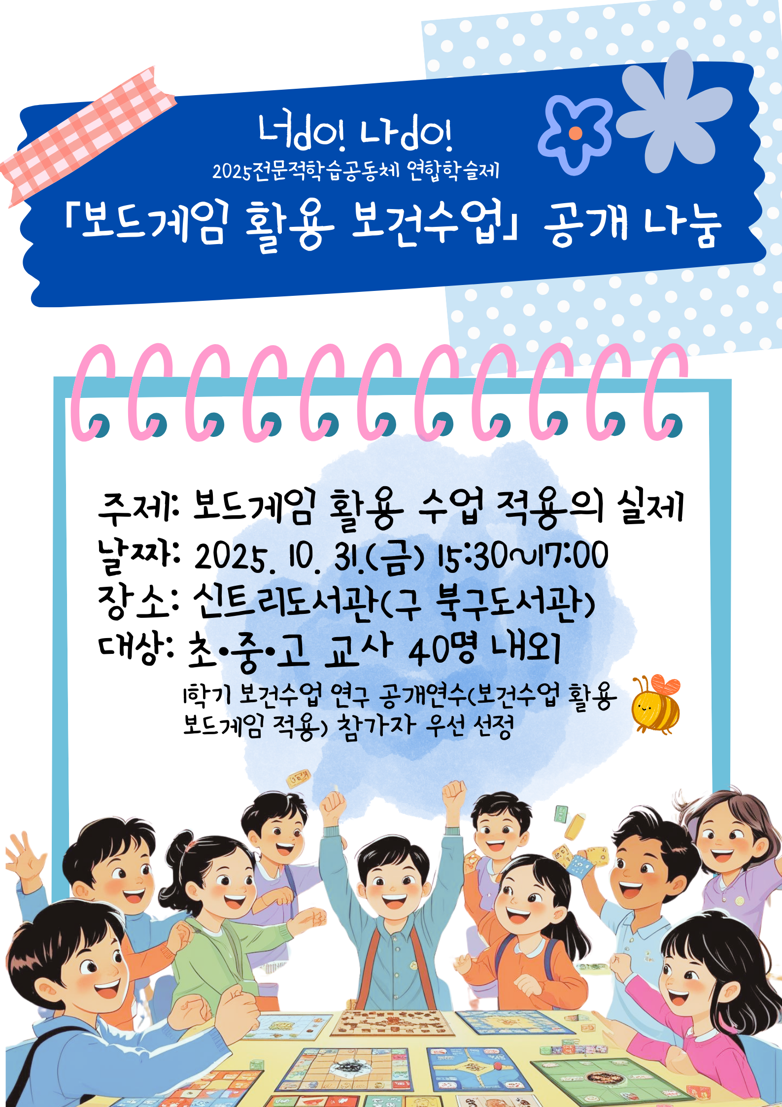 교과교육연구(회)형 보건 부평구 보드게임 활용 보건수업 적용 공동체명너do! 나do! 일시2025년 10월 31일 15:30 - 17:00 장소신트리(북구) 도서관 좌석30석 / 40석 나눔방법수업나눔(대면) 담당자산곡여중 이연수 신청기간 마감 목록보기