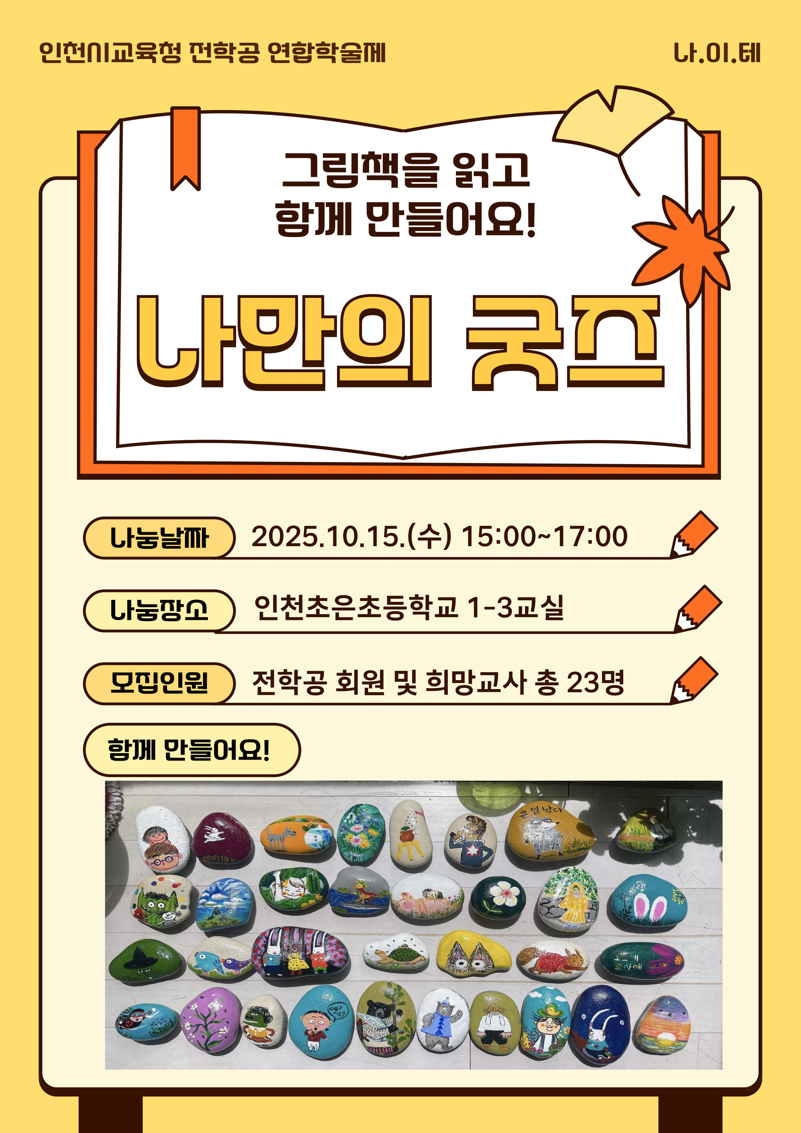 주제연구형 사회정서학습(SEL) 서구 그림책 읽고 나만의 굿즈 만들기 활동 나눔 공동체명나이테(나와 학생을 이해하는 그림책 테라피) 일시2025년 10월 15일 15:00 - 17:00 장소인천초은초 1-3교실 좌석21석 / 23석 나눔방법공개연수(대면) 담당자인천초은초 박지영 신청기간 마감 목록보기