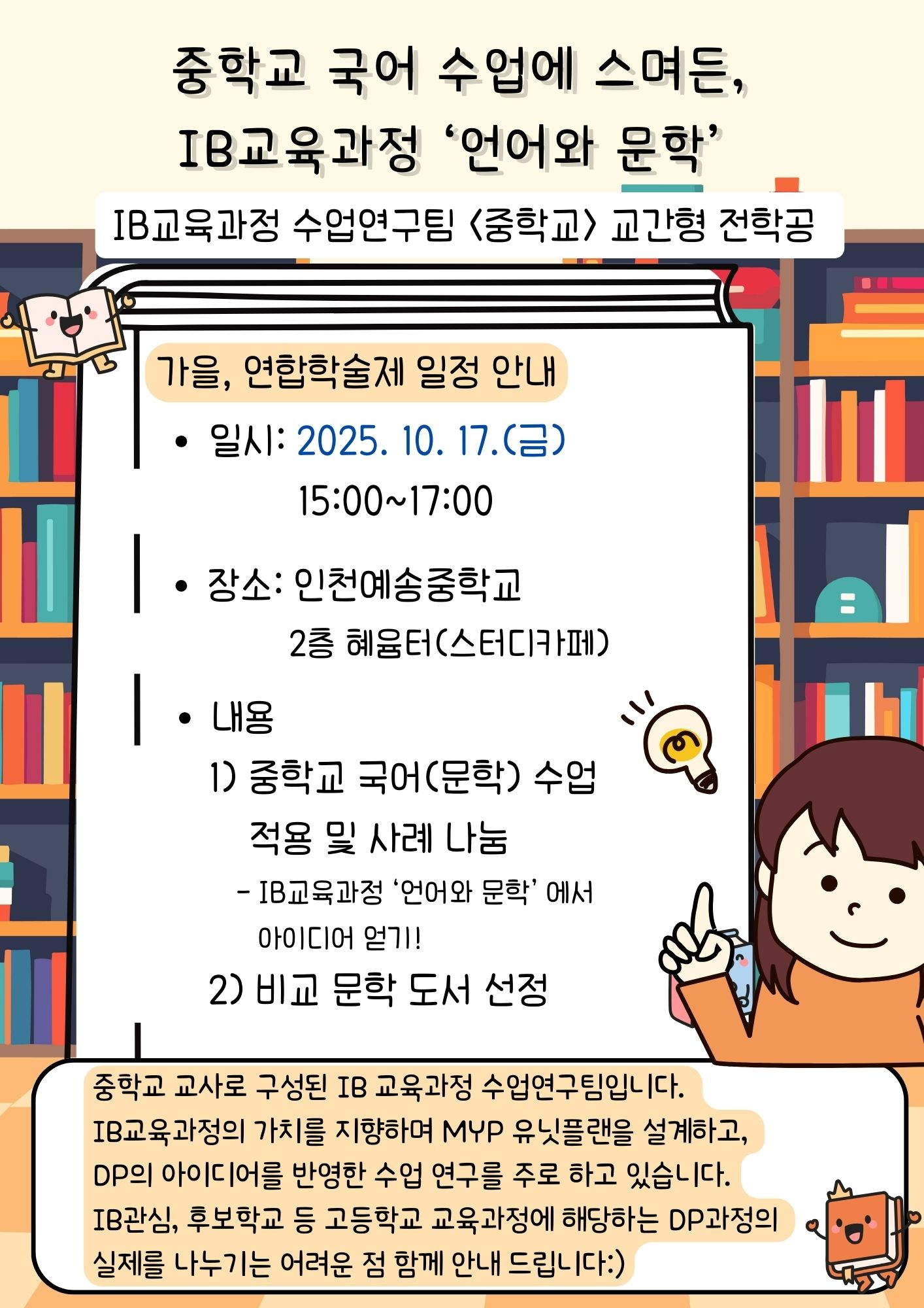 교과교육연구(회)형 국어/독서교육 연수구 중학교 국어 수업에 스며든 IB교육과정 언어와 문학 공동체명IB교육과정 수업연구팀 일시2025년 10월 17일 15:00~17:00 장소인천예송중 2층 혜윰터 좌석15석 / 15석 나눔방법워크숍(대면) 담당자인천예송중 이효선 신청마감 목록보기