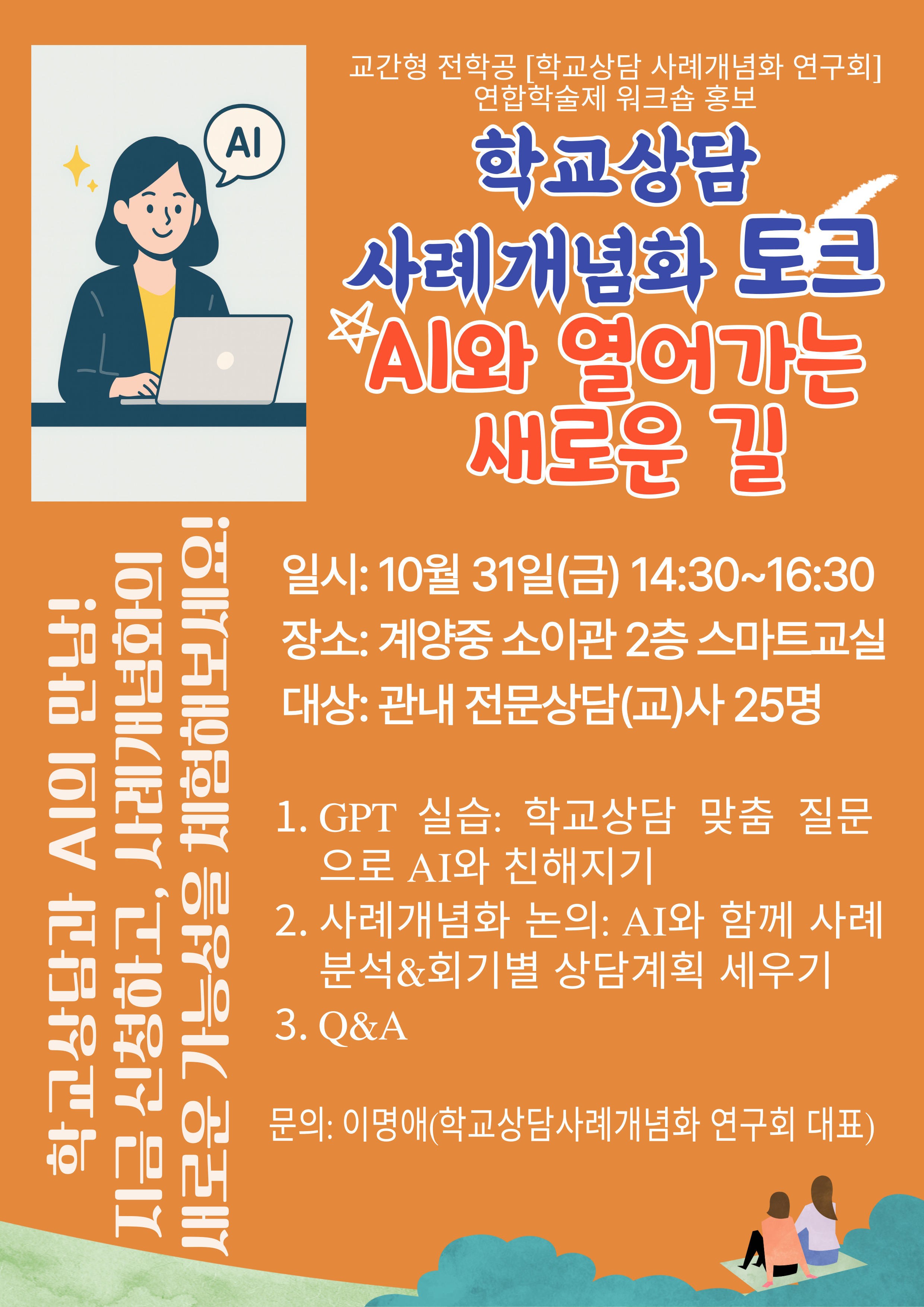 주제연구형 상담 계양구 「학교상담사례개념화 토크, AI와 열어가는 새로운 길」 공동체명학교상담 사례개념화 연구회(학사연) 일시2025년 10월 31일 14:30 ~ 16:30 장소계양중 소이관2층 스마트교실 좌석25석 / 25석 나눔방법워크숍(대면) 담당자계양중학교 이명애 신청마감 목록보기