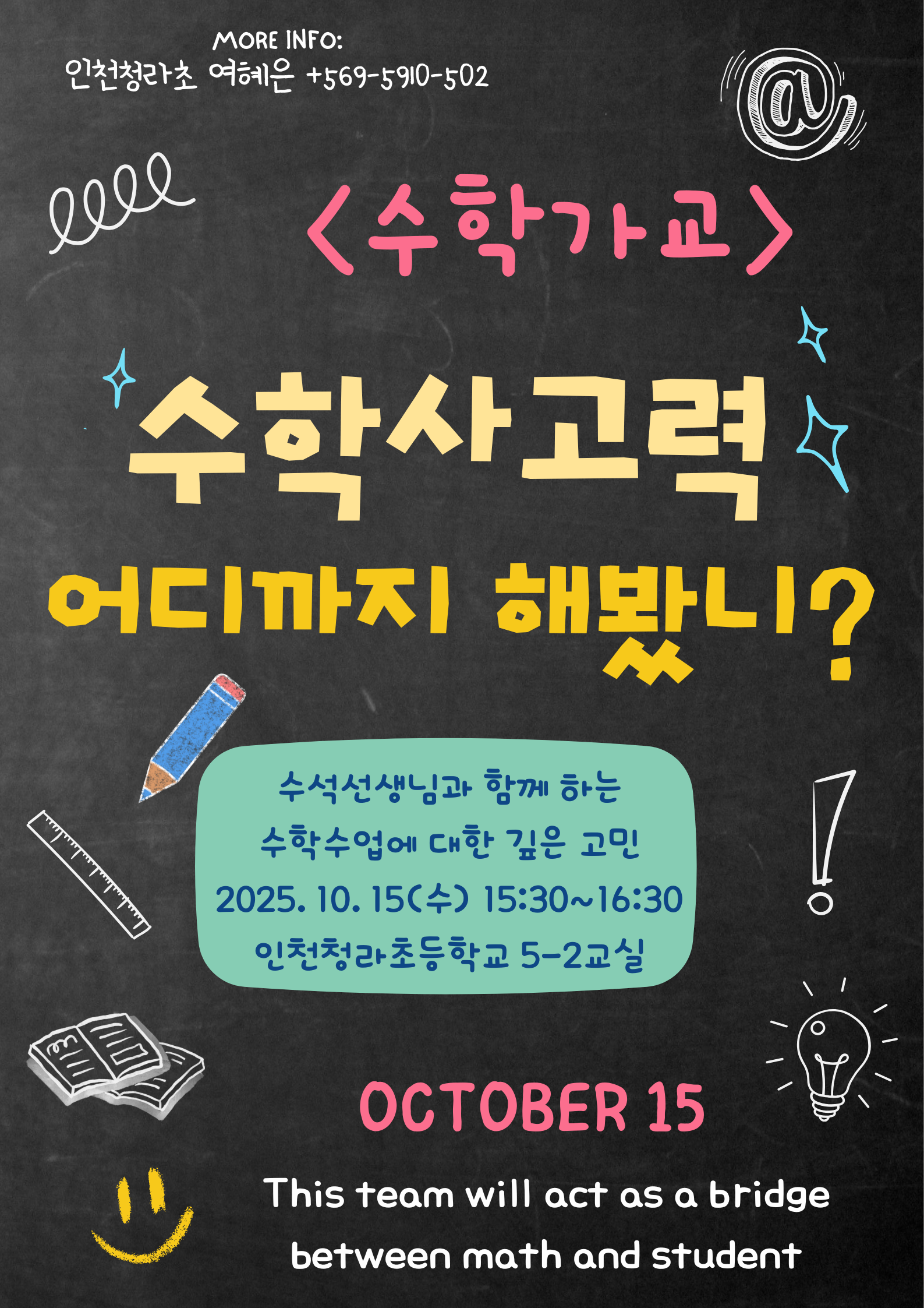 교과교육연구(회)형 수학 서구 수학사고력 어디까지 해봤니? 공동체명수학가교 일시2025년 10월 15일 15:30 - 16:30 장소인천청라초 5층 5-2교실 좌석6석 / 20석 나눔방법공개연수(대면) 담당자인천청라초 여혜은 신청기간 마감 목록보기