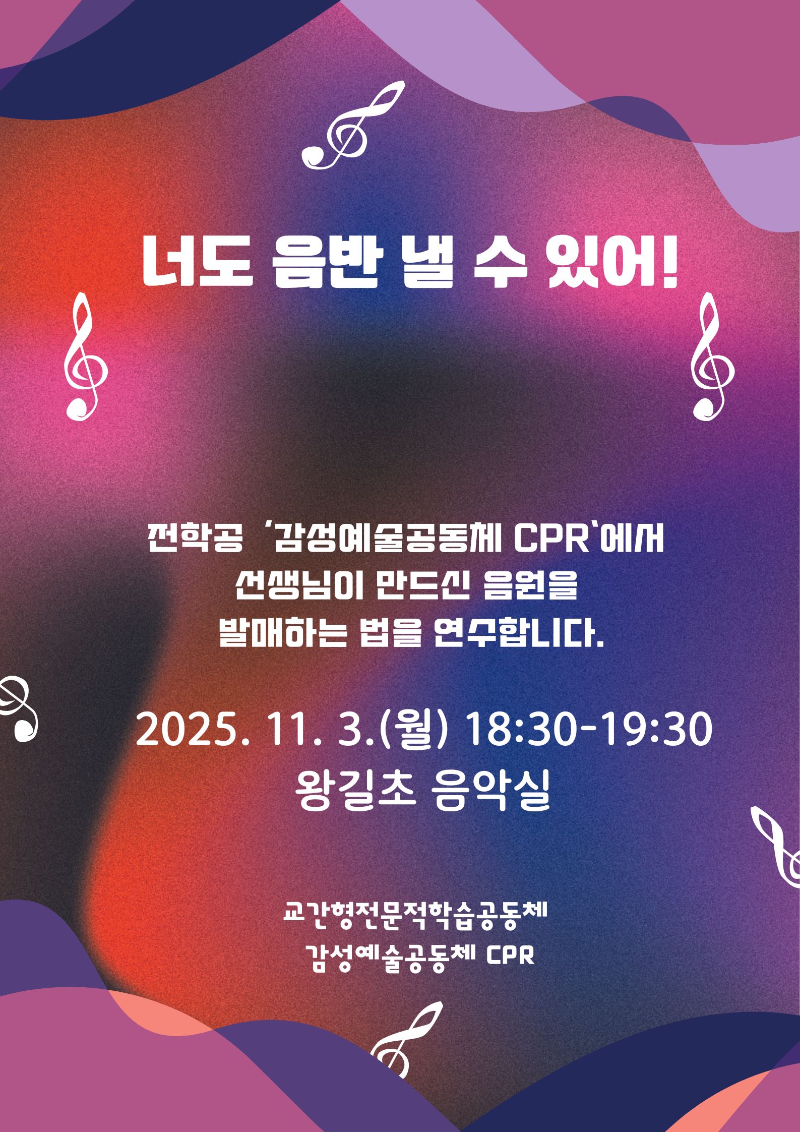 교과교육연구(회)형 예체능(음,미,체 등) 서구 음원발매 나도 할 수 있어요 공동체명감성예술공동체 CPR 일시2025년 11월 03일 18:30 - 19:30 장소인천왕길초 음악실 좌석10석 / 20석 나눔방법공개연수(대면) 담당자인천왕길초 이중환 신청기간 마감 목록보기