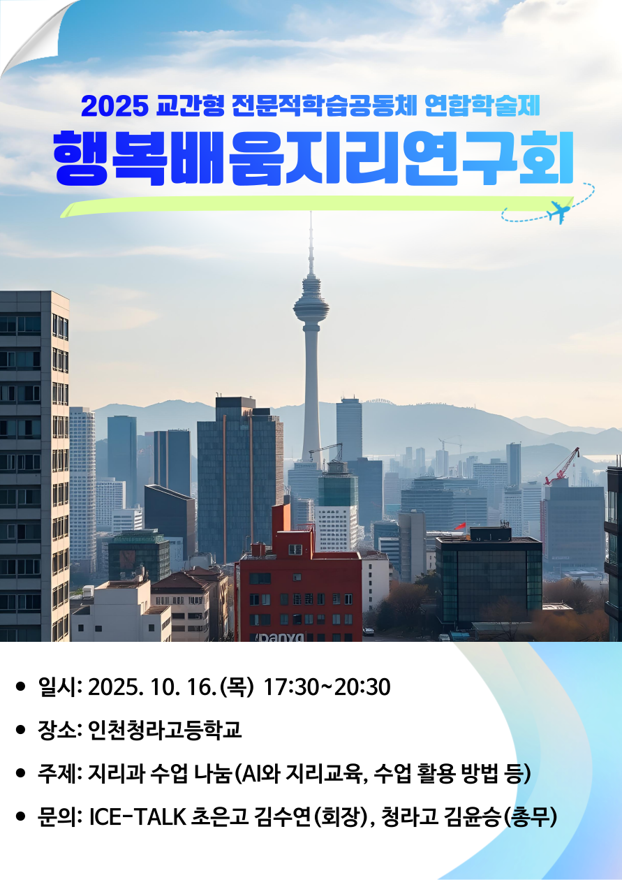 교과교육연구(회)형 인문/사회 서구 AI와 지리교육 공동체명행복배움지리연구회 일시2025년 10월 16일 17:30 ~ 20:30 장소인천청라고 2층 도서관 좌석14석 / 30석 나눔방법수업나눔(대면) 담당자인천초은고 김수연 신청기간 마감 목록보기