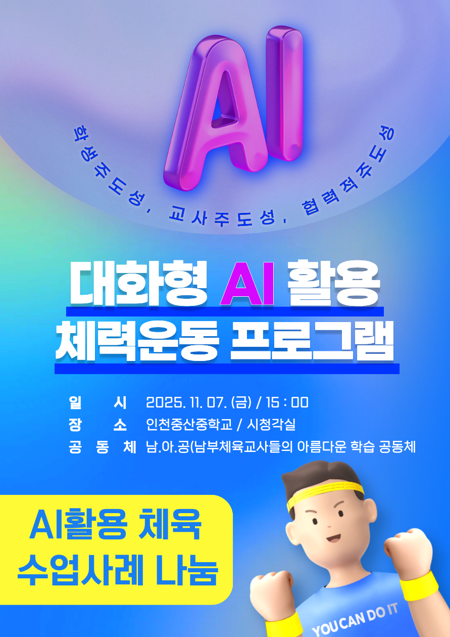 교과교육연구(회)형 예체능(음,미,체 등) 중구 AI를 활용한 체력운동 공동체명남부 체육교사들의 아름다운 학습 공동체 일시2025년 11월 07일 15:00 - 16:30 장소인천중산중 시청각실 좌석17석 / 30석 나눔방법수업나눔(대면) 담당자인천공항중 김두한 신청기간 마감 목록보기