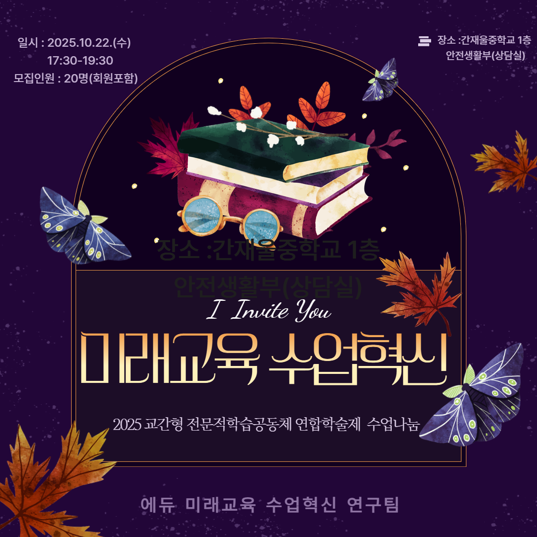 교과교육연구(회)형 예체능(음,미,체 등) 서구 체육교과 미래교육 수업혁신 공동체명에듀 미래교육 수업혁신 연구회 일시2025년 10월 22일 17:30 - 19:30 장소간재울중 상담실 좌석9석 / 20석 나눔방법수업나눔(대면) 담당자간재울중 남민현 신청기간 마감 목록보기
