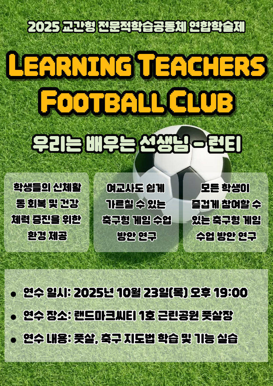 교과교육연구(회)형 예체능(음,미,체 등) 연수구 학급 구성원 모두가 즐거운 축구형 게임수업 워크숍 공동체명우리는 배우는 선생님-런티 일시2025년 10월 23일 19:00 - 21:00 장소랜드마크시티1호 체육공원 풋살장 좌석14석 / 20석 나눔방법워크숍(대면) 담당자인천약산초 안윤숙 신청기간 마감 목록보기
