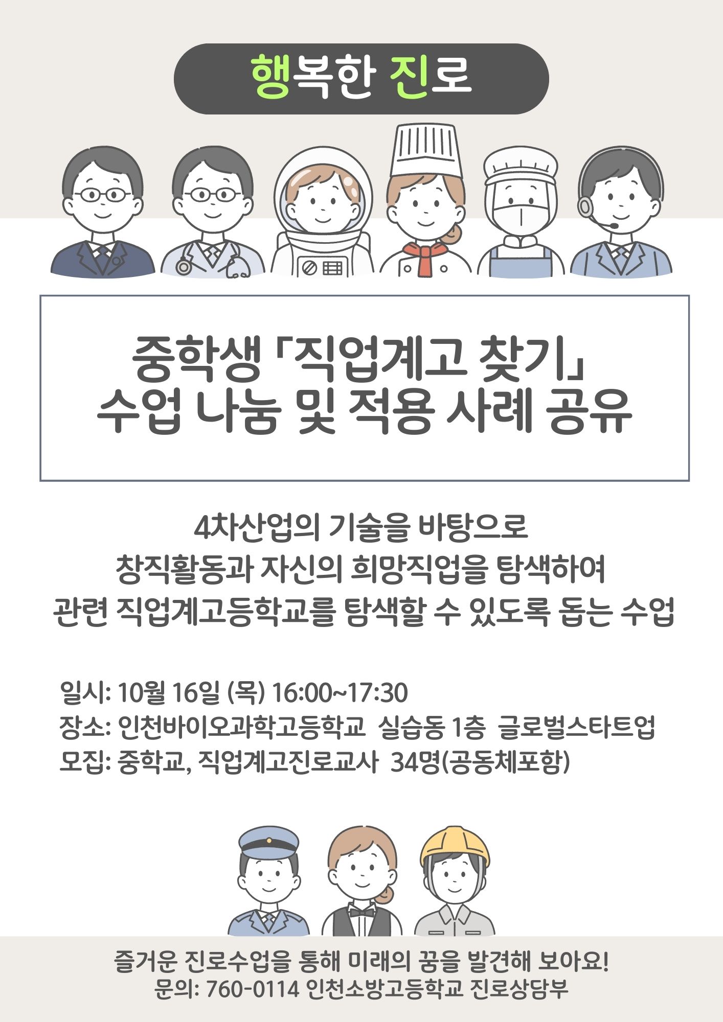 주제연구형 진로/진학/교육 연수구 중학생 [직업계고 찾기] 수업나눔 및 적용 사례 공유 공동체명행진(행복한 진로) 일시2025년 10월 16일 16:00 - 17:30 장소인천바이오과학고 실습동 1층 글로벌스타트업 좌석27석 / 34석 나눔방법수업나눔(대면) 담당자인천소방고 손재윤 신청기간 마감 목록보기