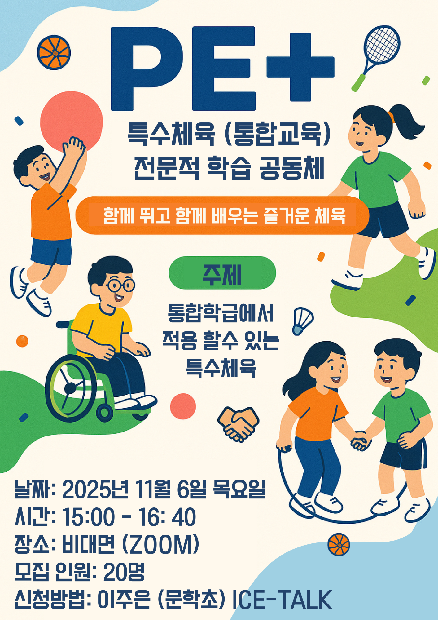 교과교육연구(회)형 특수교육 전체(비대면) 통합학급에서 적용하는 특수체육 공동체명PE+ 일시2025년 11월 06일 15:00 - 16:40 장소비대면(ZOOM) 좌석9석 / 20석 나눔방법수업나눔(비대면) 담당자인천문학초 이주은 신청기간 마감 목록보기