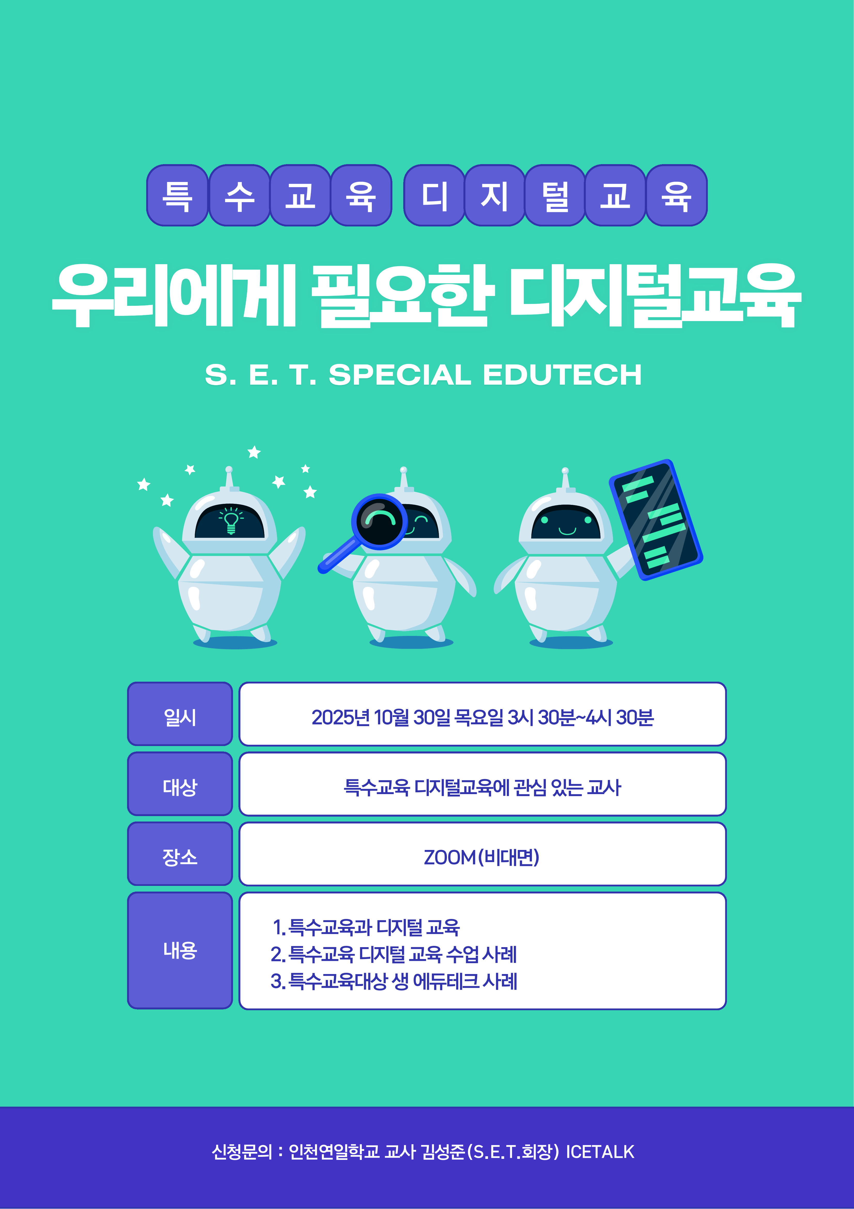 교과교육연구(회)형 특수교육 전체(비대면) 특수교육에서의 AI, 에듀테크 활용 수업 사례 공동체명S.E.T. 일시2025년 10월 30일 15:30 - 16:30 장소비대면(ZOOM) 좌석11석 / 30석 나눔방법공개연수(비대면) 담당자인천연일학교 김성준 신청기간 마감 목록보기