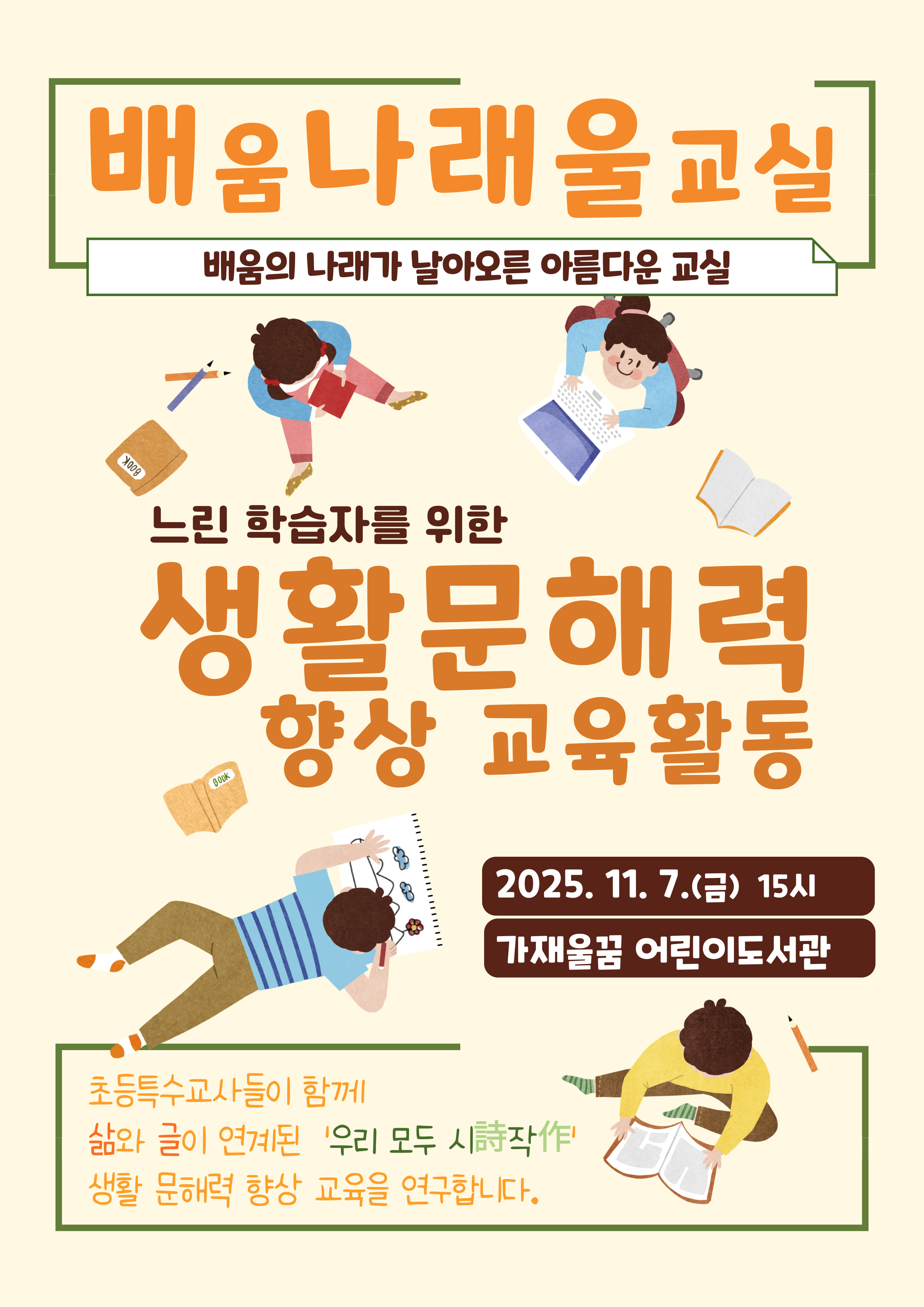 주제연구형 특수교육 서구 느린학습자를 위한 생활문해력 향상 교육활동 공동체명배움나래울교실 일시2025년 11월 07일 15:00 - 17:00 장소가재울꿈어린이도서관 프로그램실3 좌석11석 / 20석 나눔방법공개연수(대면) 담당자인천경연초 이명희 신청기간 마감 목록보기