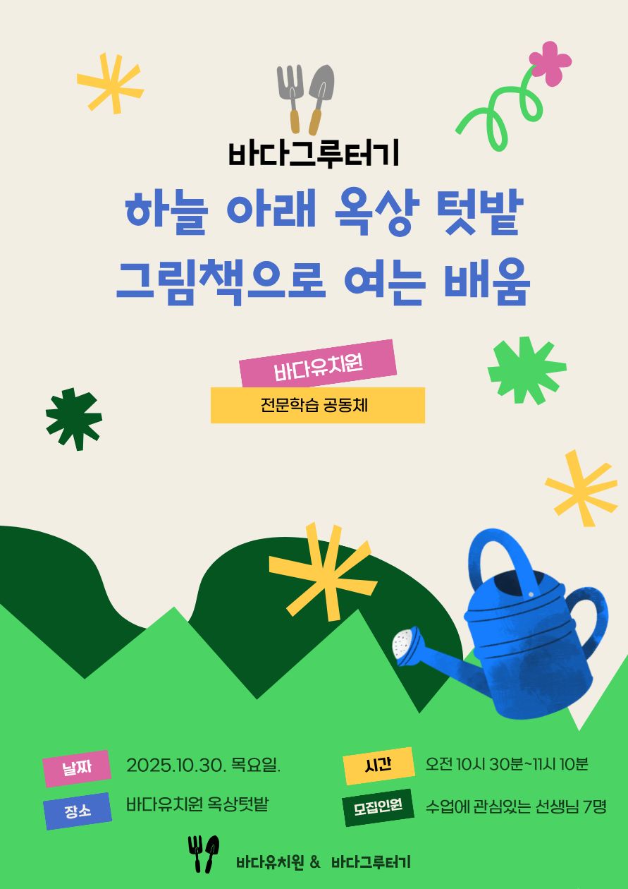 주제연구형 환경/생태 전체(비대면) 하늘아래 옥상텃밭, 그림책으로 여는 배움 공동체명바다그루터기 일시2025년 10월 30일 17:00 - 17:50 장소바다유치원 옥상텃밭 좌석11석 / 20석 나눔방법공개연수(비대면) 담당자바다유치원 송은정 신청기간 마감 목록보기
