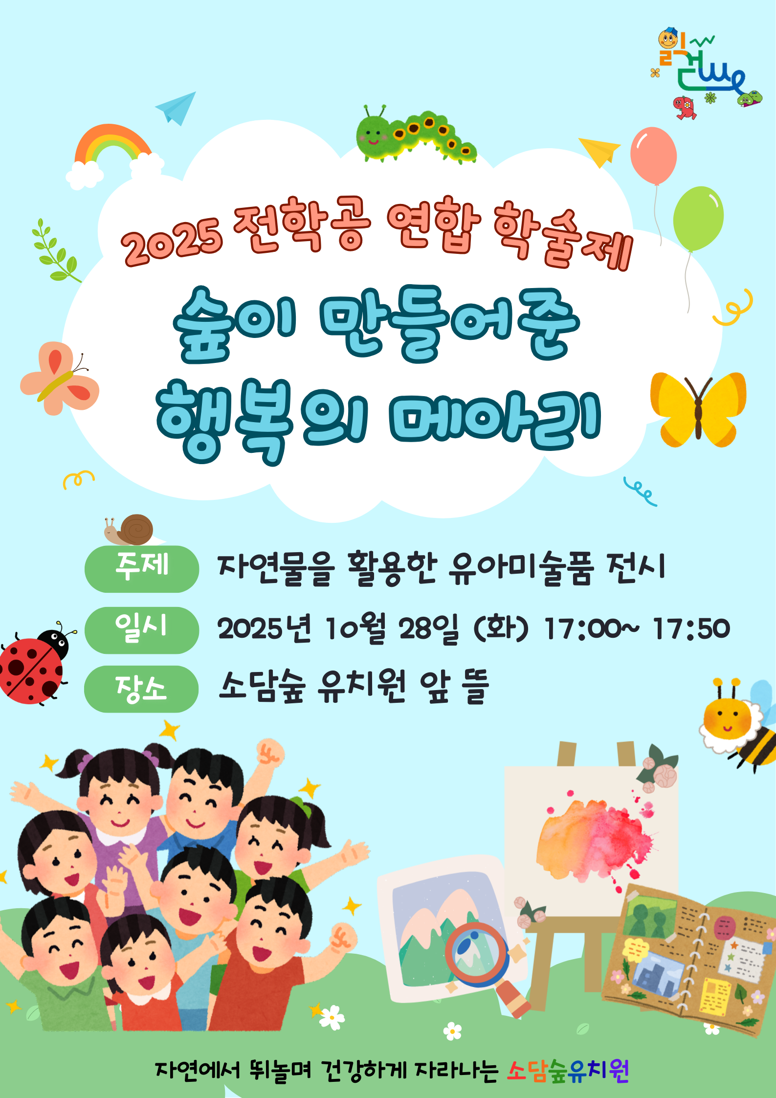 주제연구형 환경/생태 남동구 자연물로 표현한 유아들의 작품 사례 나눔 공동체명숲이 만들어준 행복의 메아리 일시2025년 10월 28일 17:00 - 17:50 장소소담숲유치원 뜰 (바깥 놀이터) 좌석16석 / 25석 나눔방법전시워크숍(대면) 담당자소담숲유치원 이아현 신청기간 마감 목록보기