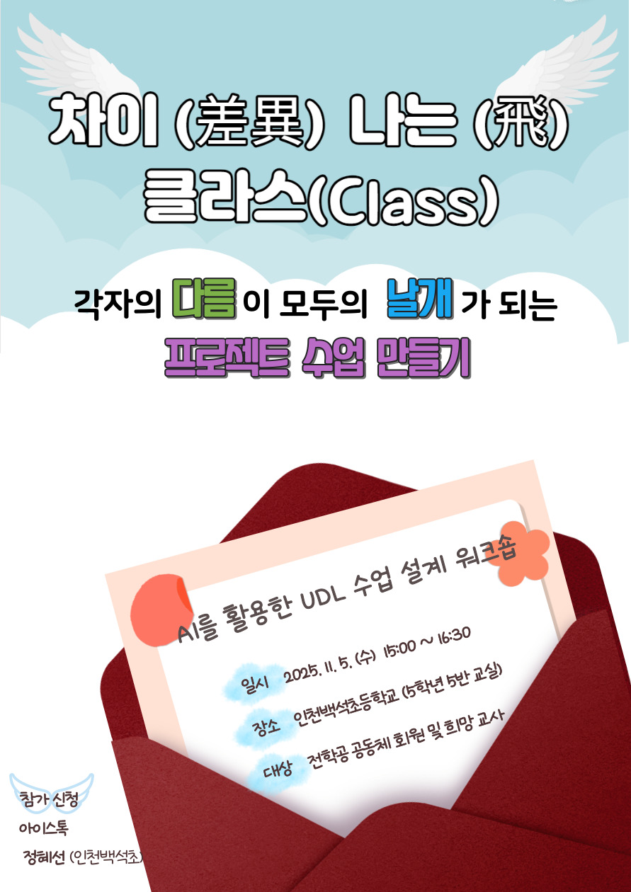 주제연구형 AI・디지털교육/에듀테크 서구 AI를 활용한 UDL 적용 수업 설계 공동체명차이(差異) 나는(飛) 클라스(Class) 일시2025년 11월 05일 15:00~16:30 장소인천백석초 좌석9석 / 20석 나눔방법워크숍(대면) 담당자인천백석초 정혜선 신청기간 마감 목록보기