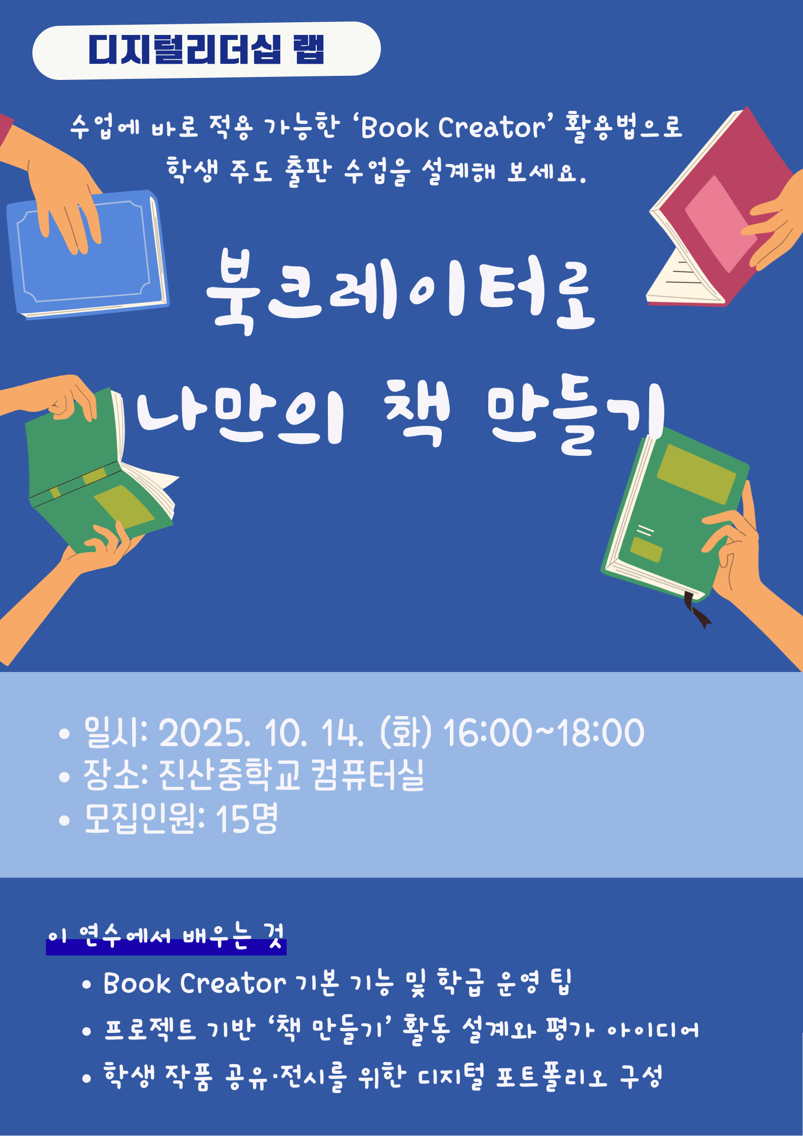 주제연구형 기타 계양구 북크리에이터로 나만의 책 만들기 공동체명디지털러닝 리더십 랩 일시2025년 10월 14일 16:00 - 18:00 장소진산중학교 컴퓨터실 좌석11석 / 15석 나눔방법워크숍(대면) 담당자진산중 임혜란 신청기간 마감 목록보기