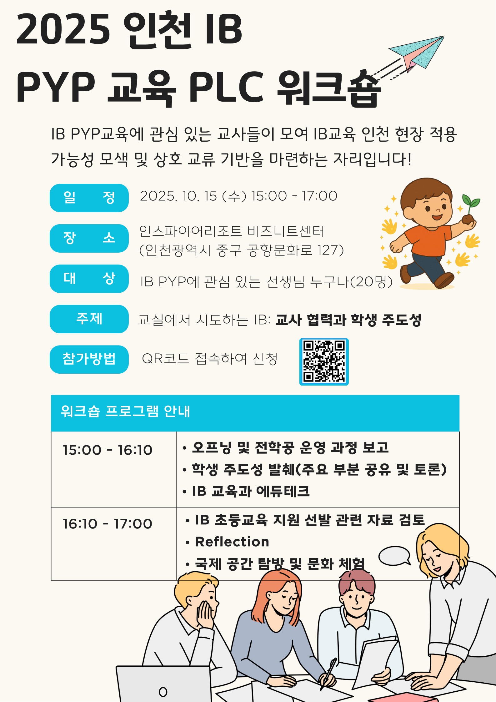 주제연구형 교육과정(IB 등) 중구 교실에서 시도하는 IB: 교사 협력과 학생 주도성 공동체명IB교육 6주제 PYP 탐구마루 일시2025년 10월 15일 15:00 - 17:00 장소인스파이어리조트 비즈니스센터 회의실 좌석13석 / 20석 나눔방법워크숍(대면) 담당자인천금곡초 박지성 신청기간 마감 목록보기