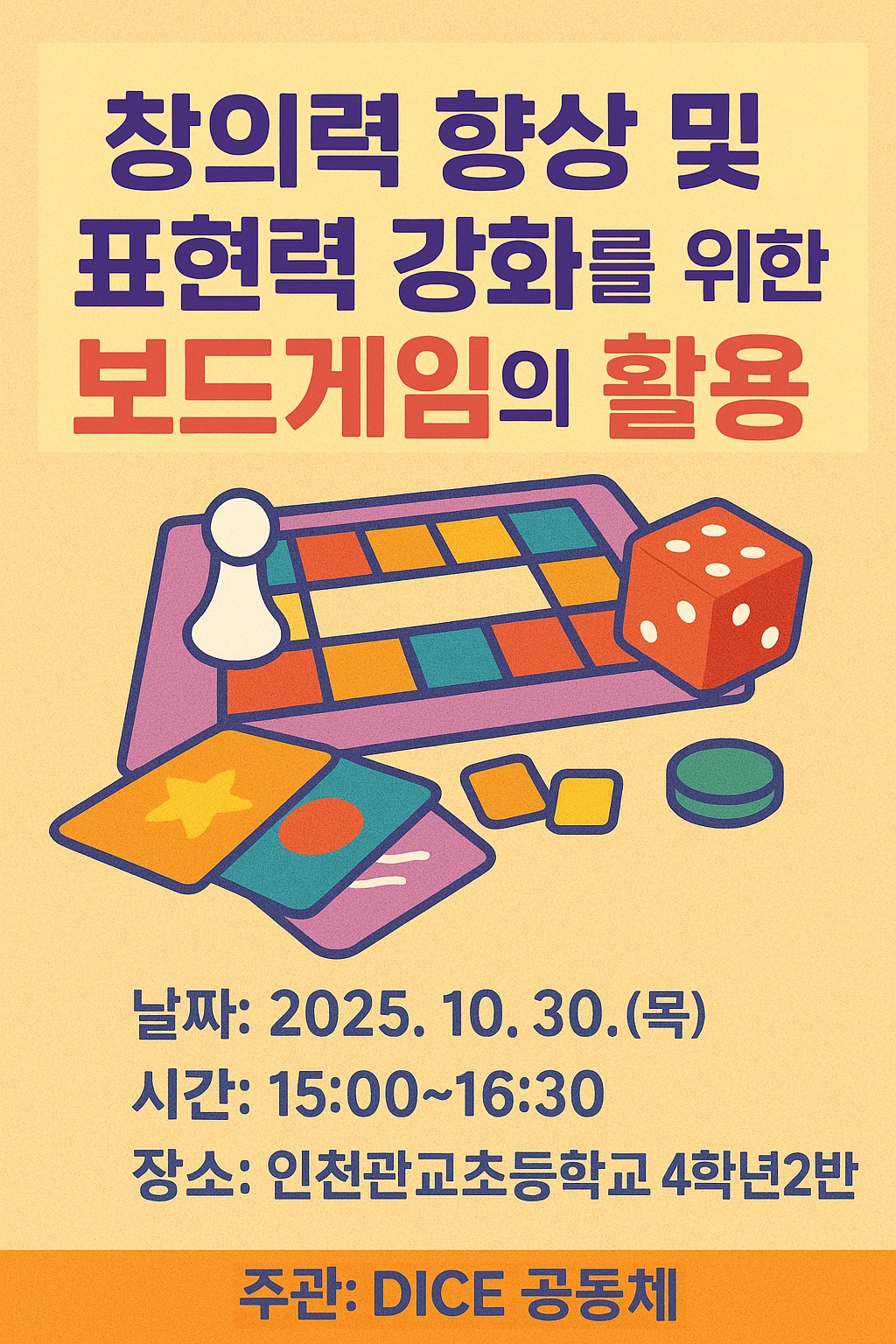 주제연구형 놀이교육 미추홀구 창의력 향상 및 표현력 강화를 위한 보드게임의 활용 공동체명깊이있는 사고를 만드는 DICE 일시2025년 10월 30일 15:00 - 16:30 장소인천관교초 4-2교실 좌석15석 / 16석 나눔방법워크숍(대면) 담당자인천관교초 한정현 신청기간 마감 목록보기