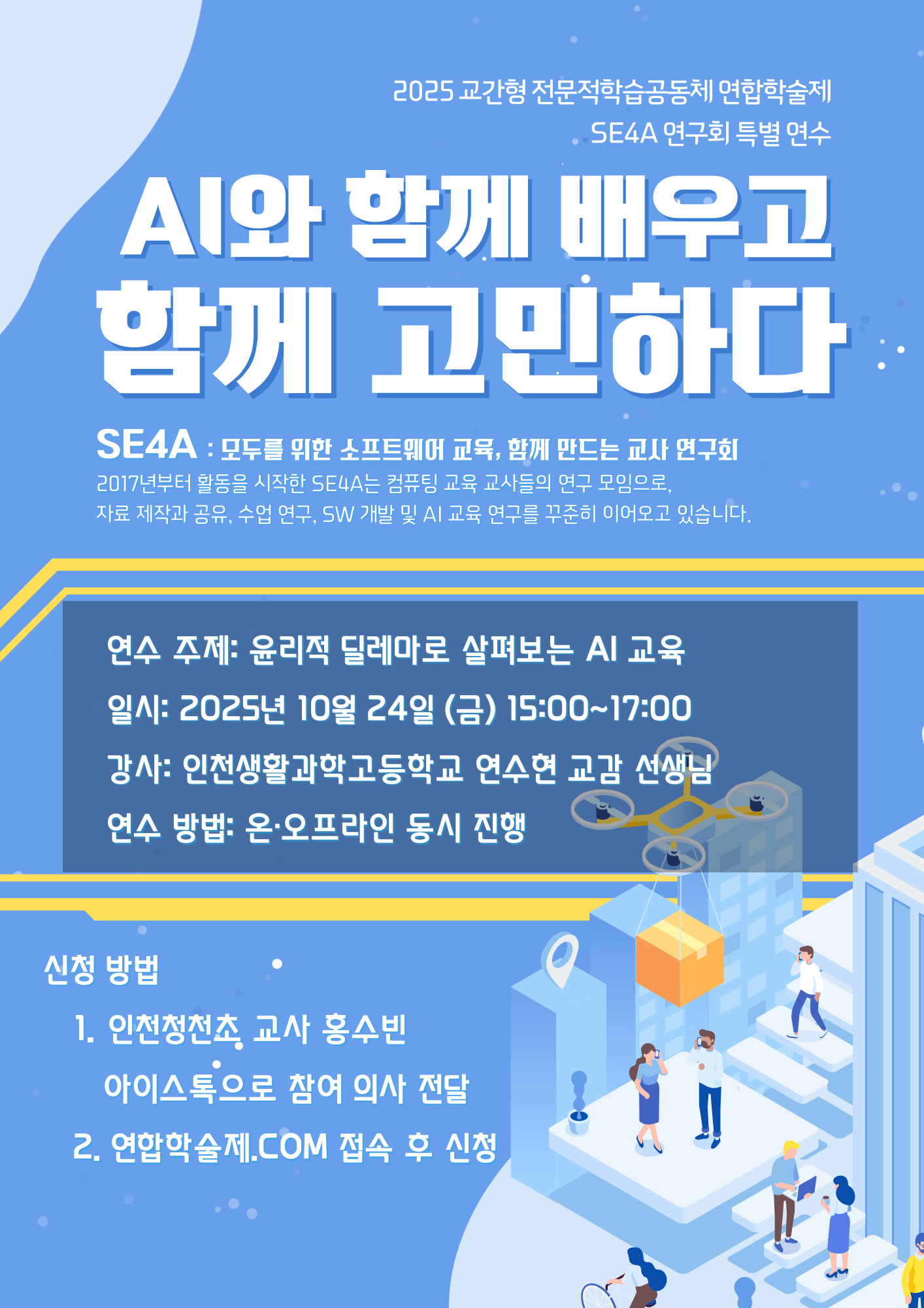 교과교육연구(회)형 미래교육 부평구 윤리적 딜레마로 살펴보는 AI 교육 공동체명SE4A 일시2025년 10월 24일 15:00 - 17:00 장소인천청천초 5층 음악실 좌석16석 / 25석 나눔방법세미나 (대면+비대면) 담당자인천청천초 홍수빈 신청기간 마감 목록보기