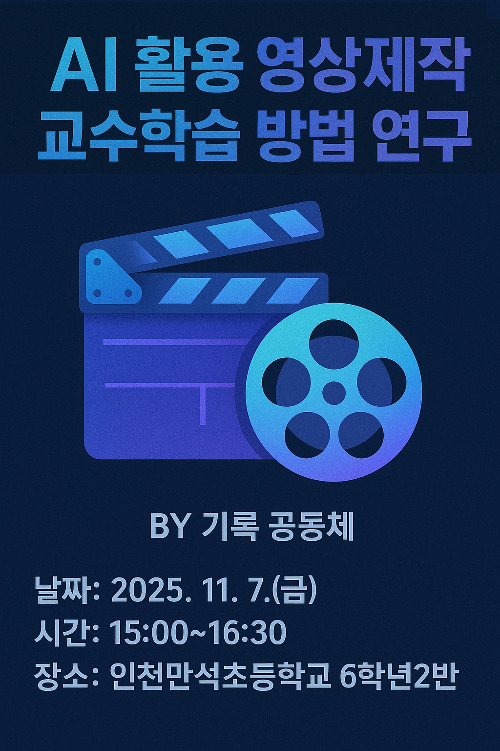 주제연구형 미래교육 동구 AI활용 영상제작 교수학습 방법 연구 공동체명기록 일시2025년 11월 07일 15:00 - 16:30 장소인천만석초 6-2교실 좌석15석 / 16석 나눔방법워크숍(대면) 담당자인천만석초 박성우 신청기간 마감 목록보기
