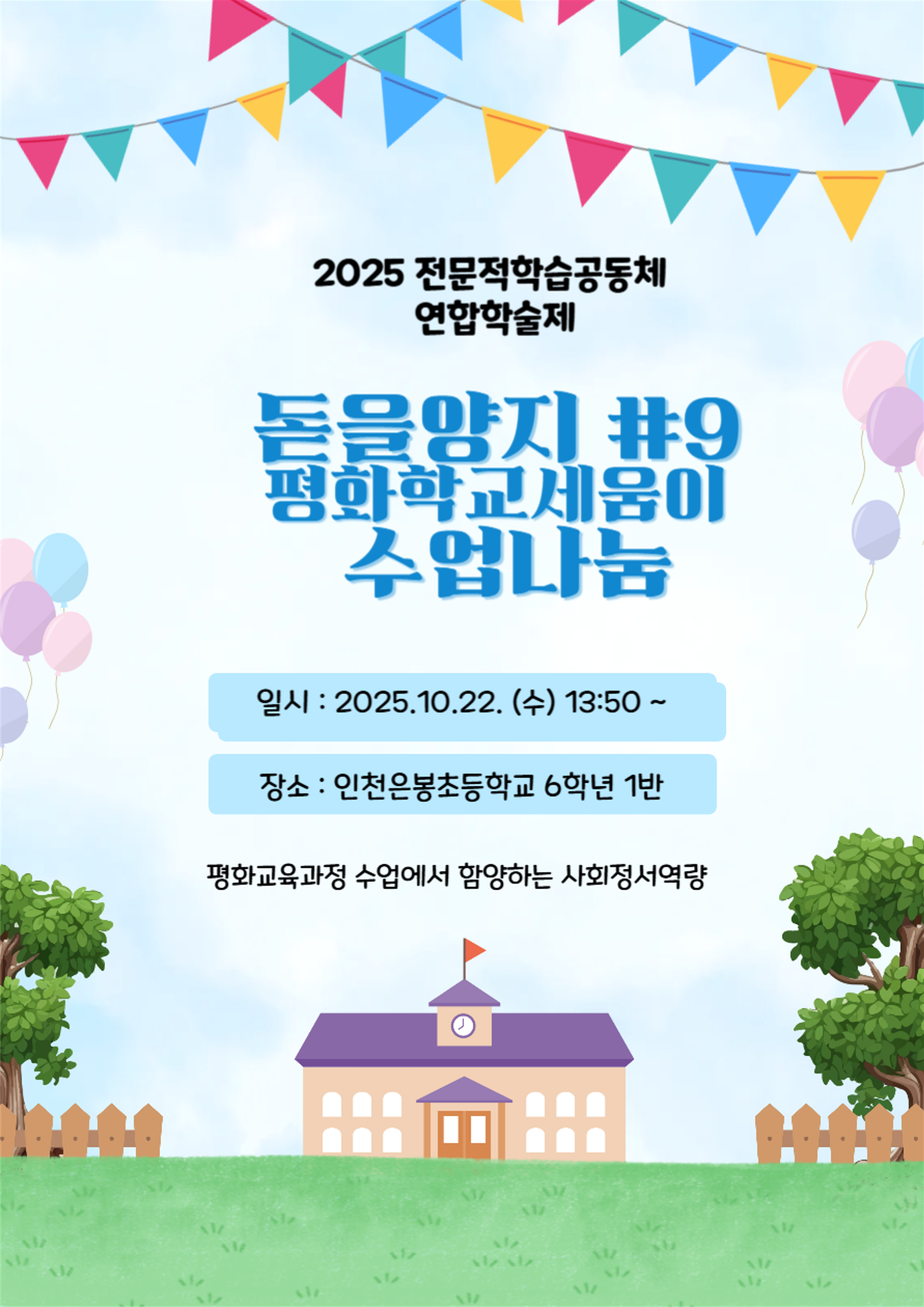 교과교육연구(회)형 사회정서학습(SEL) 남동구 평화수업을 통한 사회정서역량 기르기 공동체명돋을양지 평화학교세움이#9 일시2025년 10월 22일 13:50 - 16:30 장소인천은봉초 6-1교실 좌석15석 / 35석 나눔방법수업나눔(대면) 담당자인천장아초 조명화 신청기간 마감 목록보기