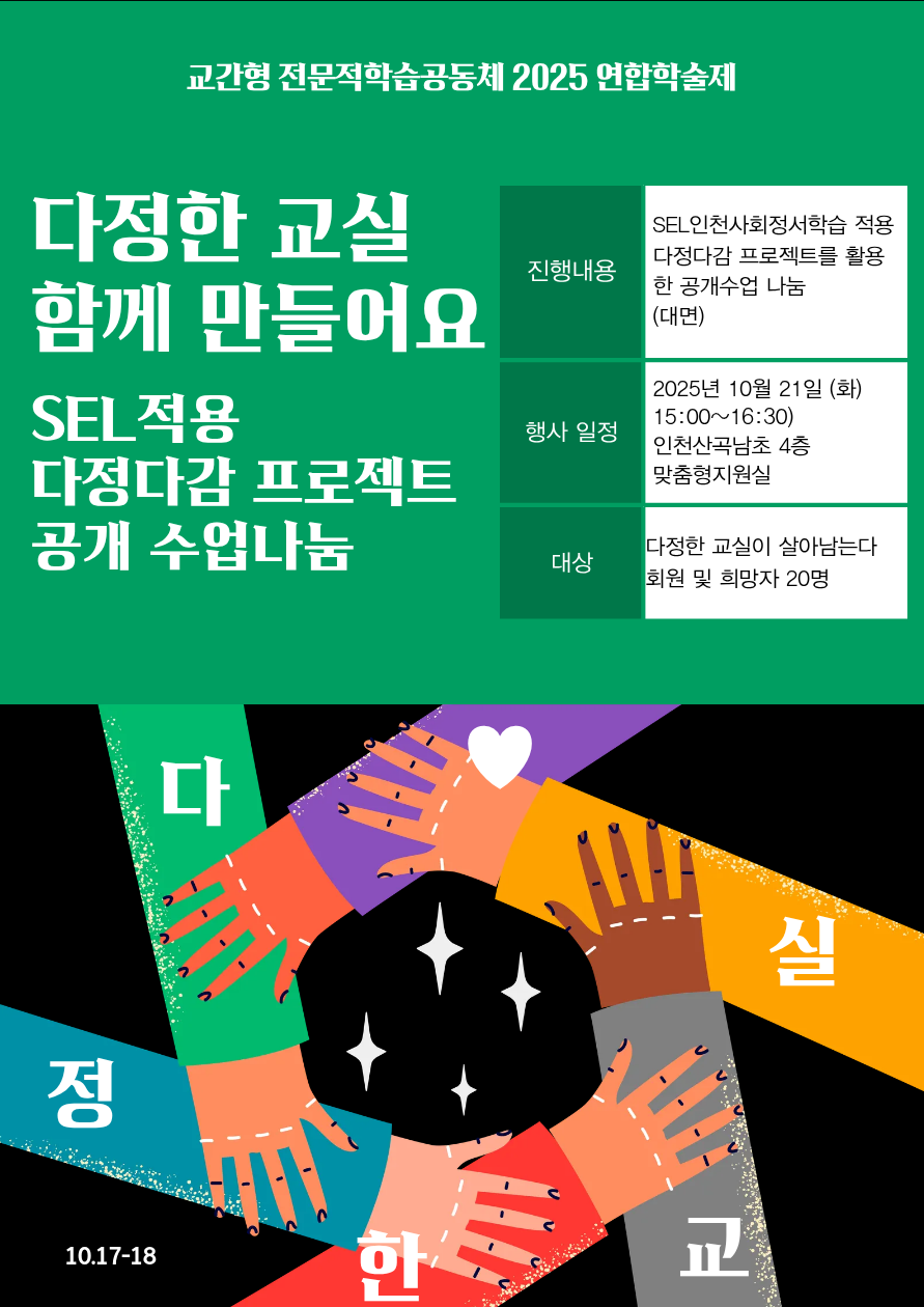 주제연구형 사회정서학습(SEL) 부평구 SEL 주제 다정다감 프로젝트 적용 수업 나눔 공동체명다정한교실이살아남는다 일시2025년 10월 21일 15:00 - 16:30 장소인천산곡남초 4층 맞춤형지원실 좌석20석 / 20석 나눔방법수업나눔(대면) 담당자인천산곡남초 조성경 신청마감 목록보기
