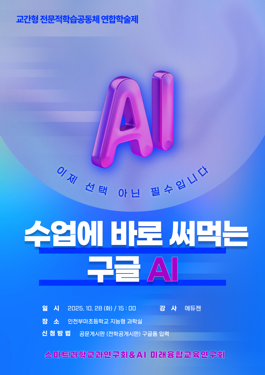 연합팀 정보/실과 부평구 구글AI활용교육 공동체명AI미래융합연구회, 스마트 과학교과연구회 일시2025년 10월 28일 15:00 - 16:40 장소인천부마초 지능형과학실 좌석6석 / 30석 나눔방법공개연수(대면) 담당자부곡초 구현희 신청기간 마감 목록보기