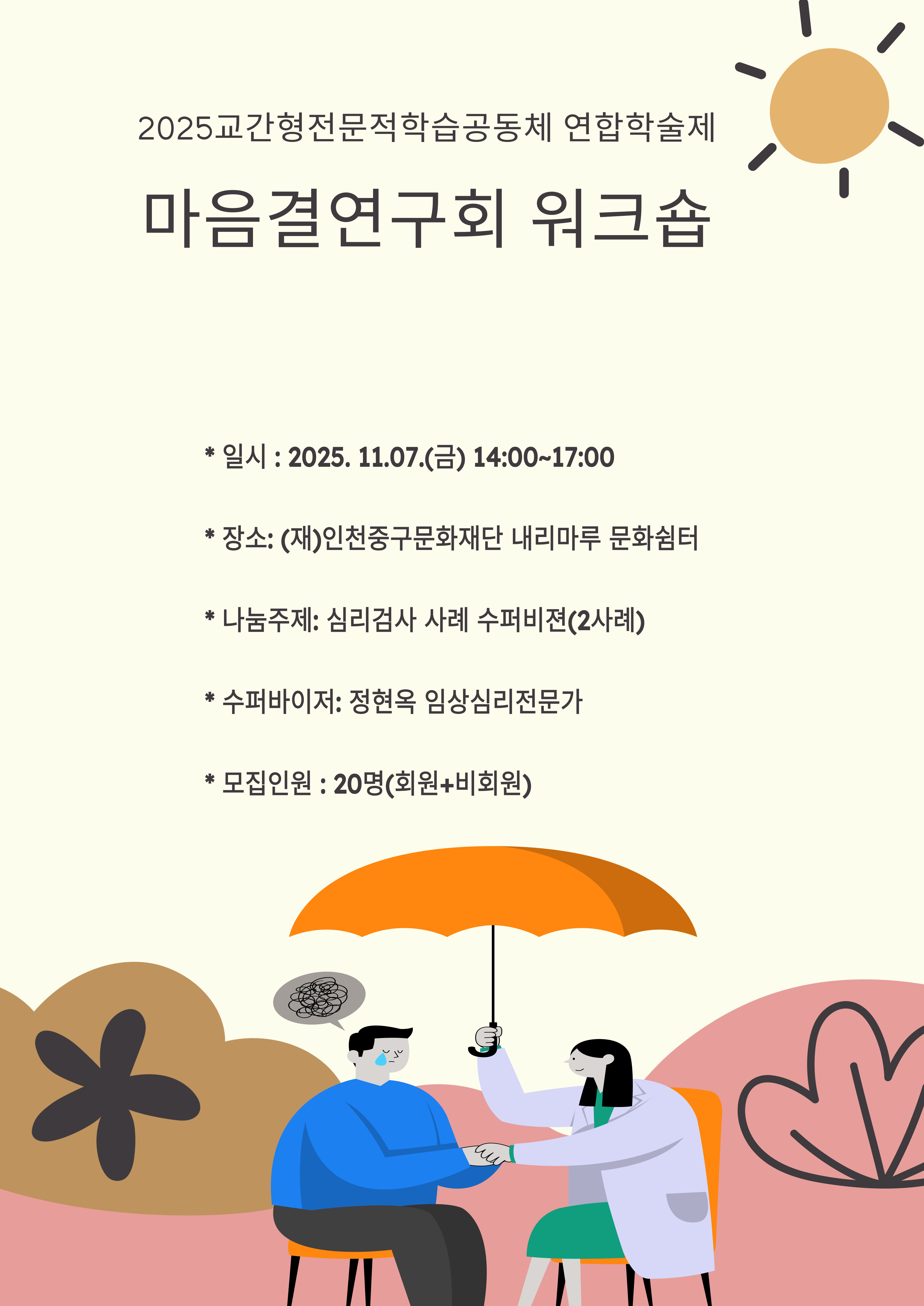 주제연구형 상담 중구 심리검사 사례 수퍼비전 공동체명마음결연구회 일시2025년 11월 07일 14:00 ~ 17:00 장소인천중구문화재단 내리마루문화쉼터 (별빛+달빛마루) 좌석21석 / 21석 나눔방법워크숍(대면) 담당자인성여중 이문영 신청마감 목록보기