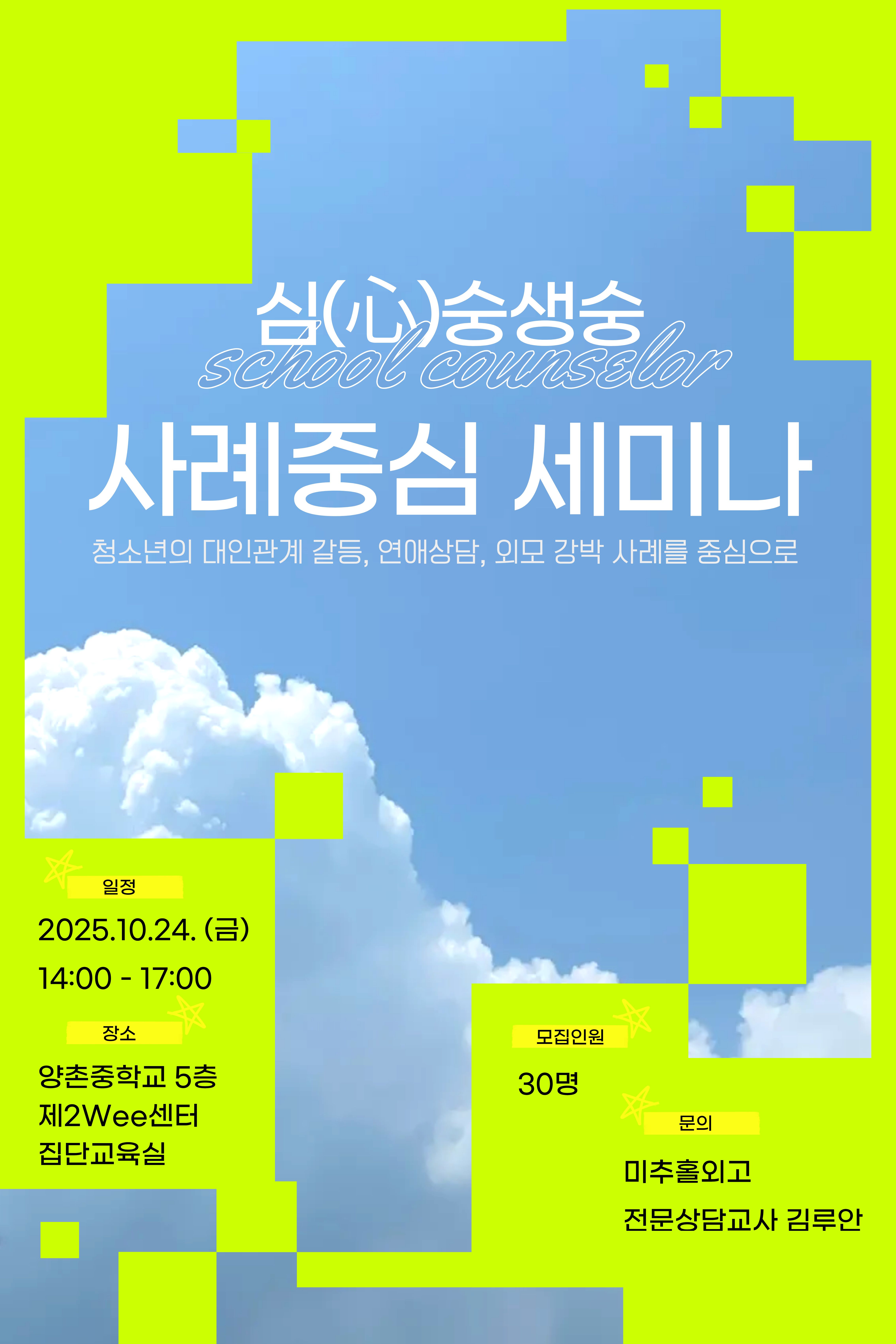 주제연구형 상담 계양구 사례 중심 세미나(청소년의 대인관계 갈등, 연애 상담, 외모 강박) 공동체명심(心)숭생숭 일시2025년 10월 24일 14:00 ~ 17:00 장소양촌중 5층 제2wee센터 집단교육실 좌석20석 / 30석 나눔방법세미나(대면) 담당자미추홀외고 김루안 신청기간 마감 목록보기