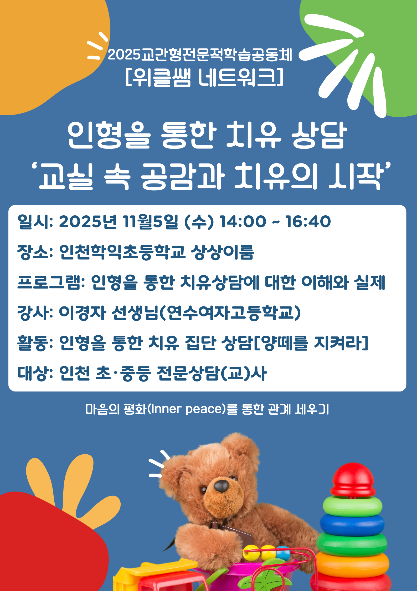 주제연구형 상담 미추홀구 인형을 통한 치유 상담에 대한 이해와 실제 [양떼를 지켜라] 공동체명위클쌤 네트워크 일시2025년 11월 05일 14:00 ~ 16:40 장소인천학익초 상상이룸 좌석21석 / 21석 나눔방법워크숍(대면) 담당자인천학산초 홍상희 신청마감 목록보기