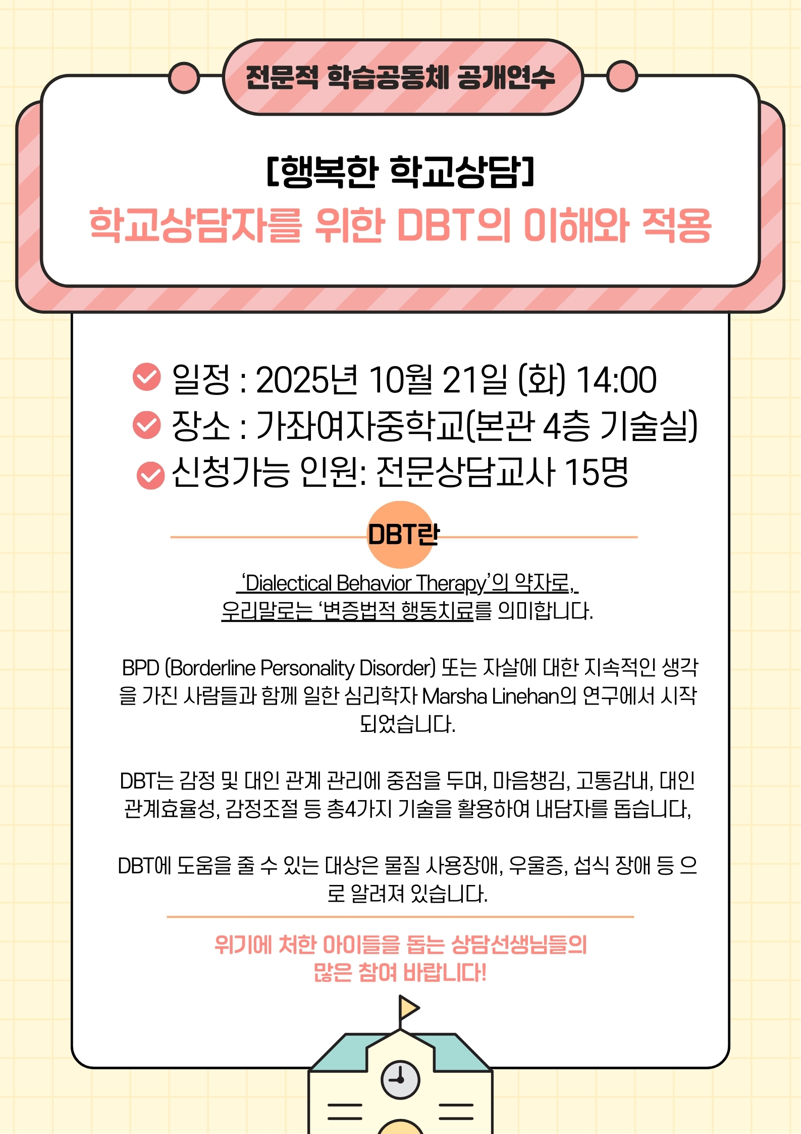 주제연구형 상담 서구 학교상담자를 위한 DBT의 이해와 적용 공동체명행복한 학교상담 일시2025년 10월 21일 14:00 ~ 17:00 장소인천가좌여자중학교 본관 4층 기술실 좌석16석 / 30석 나눔방법공개연수(대면) 담당자명현중학교 김보라 신청기간 마감 목록보기