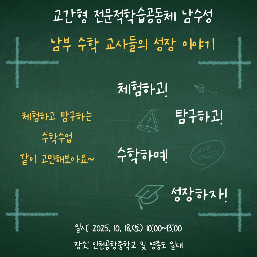 교과교육연구(회)형 수학 중구 체험하고 탐구하는 행복한 수학수업 공동체명남부 수학 교사들의 성장 이야기(남수성) 일시2025년 10월 18일 10:00 ~ 13:00 장소인천공항중 및 영종도 일대 좌석3석 / 15석 나눔방법워크숍(대면) 담당자인천공항중 이선우 신청기간 마감 목록보기