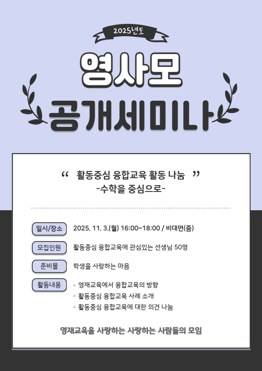 주제연구형 수학 전체(비대면) 활동중심 융합교육 활동 나눔 공동체명영사모(영재교육을 사랑하는 사람들의 모임) 일시2025년 11월 03일 16:00 - 18:00 장소비대면(ZOOM) 좌석10석 / 50석 나눔방법세미나(비대면) 담당자인천광역시교육청 AI융합교육원 안창호 신청기간 마감 목록보기