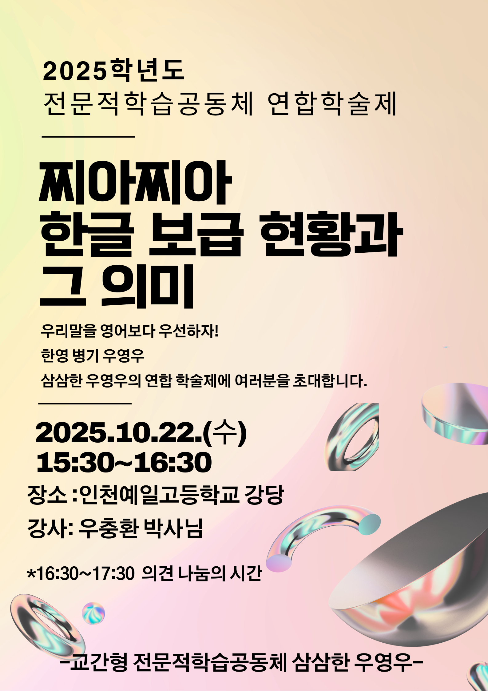 주제연구형 언어/외국어 계양구 찌아찌아 한글 보급 현황과 그 의미 공동체명삼삼한 우영우 일시2025년 10월 22일 15:30 - 17:30 장소인천예일고 강당 좌석6석 / 50석 나눔방법공개연수(대면) 담당자인천세원고 이승진 신청기간 마감 목록보기