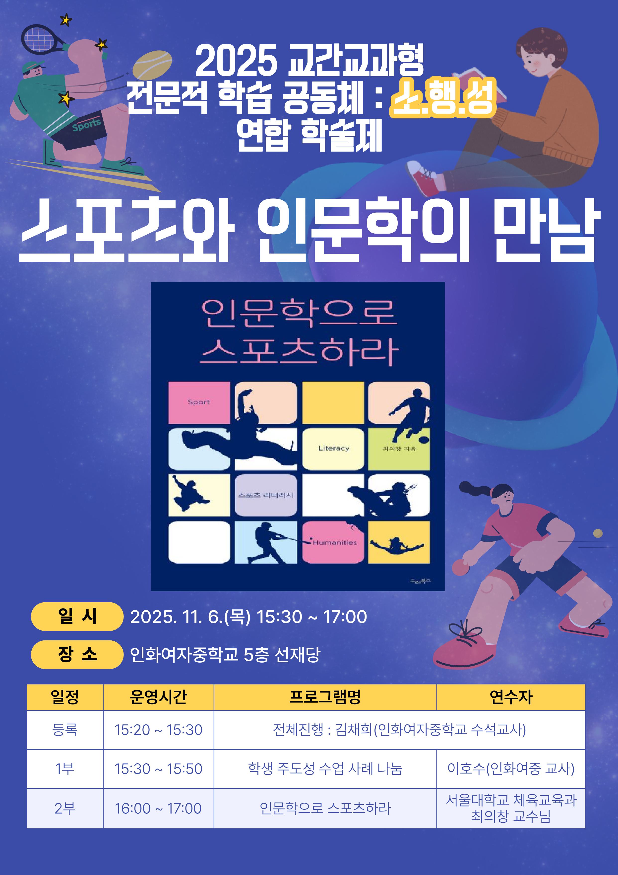 교과교육연구(회)형 예체능(음,미,체 등) 미추홀구 인문학으로 스포츠하라 공개연수 및 수업나눔 공동체명소.행.성 일시2025년 11월 06일 15:30 - 17:00 장소인화여중 5층 선재당 좌석17석 / 50석 나눔방법공개연수 및 수업나눔(대면) 담당자인화여자중 김채희 신청기간 마감 목록보기