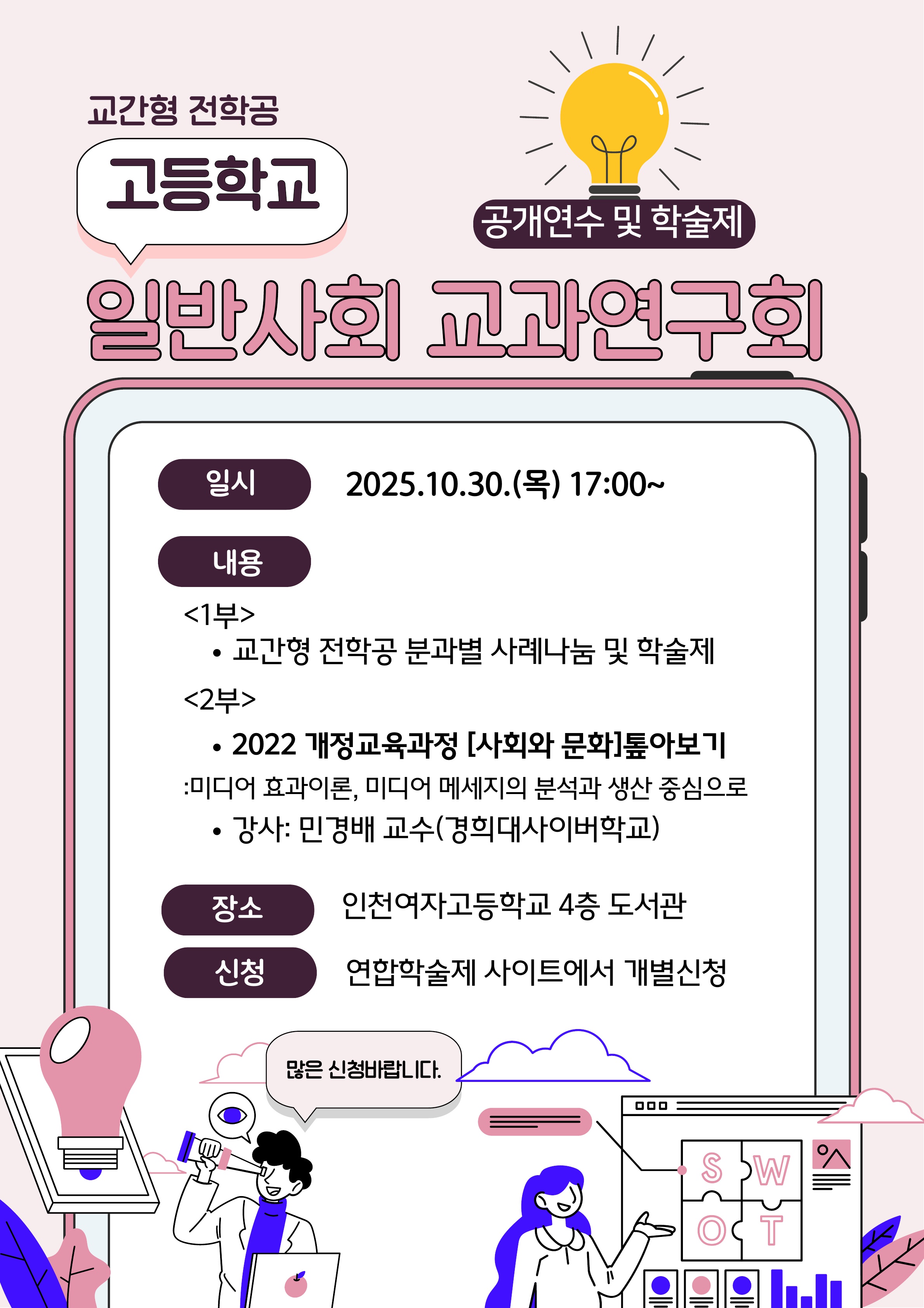 교과교육연구(회)형 인문/사회 연수구 2022개정 [사회와 문화] 톺아보기 공동체명고등학교 일반사회 교과연구회 일시2025년 10월 30일 17:00 ~ 20:00 장소인천여고 4층 도서관 좌석24석 / 40석 나눔방법공개연수(대면) 담당자인천국제고 이성근 신청기간 마감 목록보기