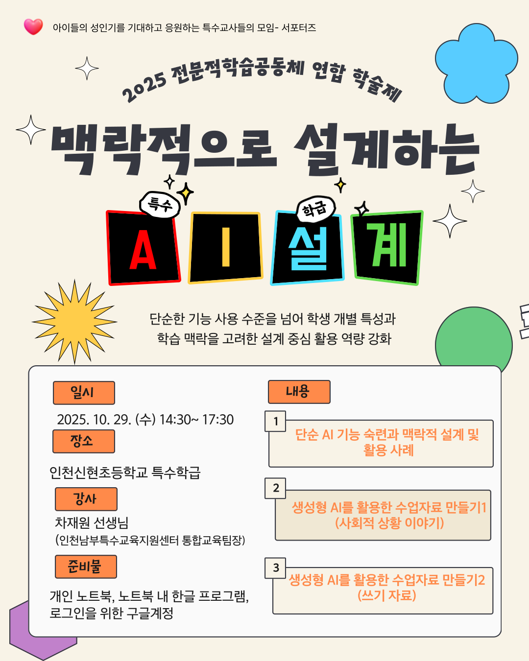 주제연구형 특수교육 서구 맥락적으로 설계하는 AI 특수학급 공동체명서포터즈 일시2025년 10월 29일 14:30 - 17:30 장소인천신현초 특수학급 좌석10석 / 15석 나눔방법공개연수(대면) 담당자인천가원초 김수정 신청기간 마감 목록보기