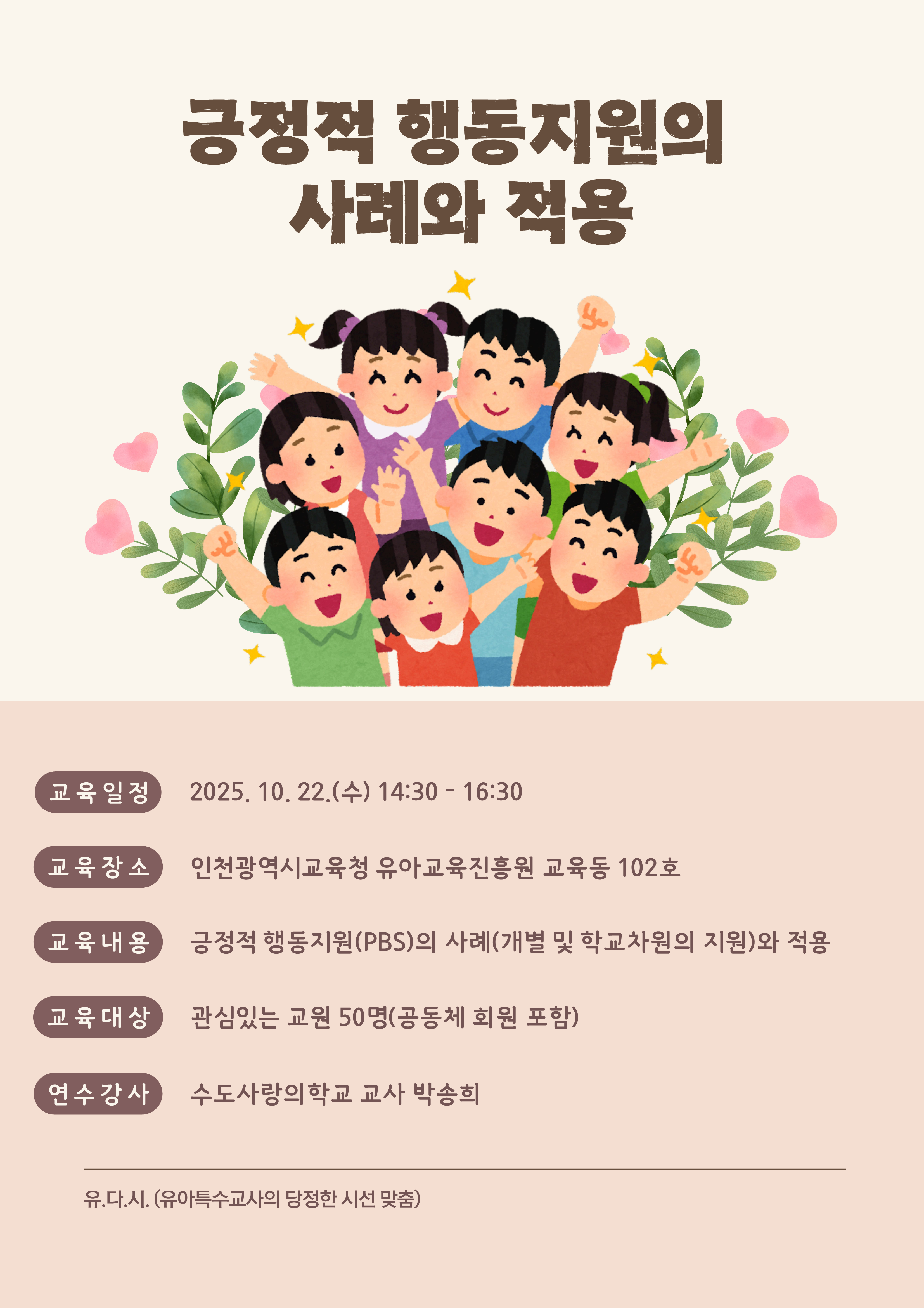 주제연구형 특수교육 서구 긍정적 행동지원의 사례와 적용 공동체명유.다.시(유아특수교사의 다정한 시선맞춤) 일시2025년 10월 22일 14:30 - 16:30 장소인천광역시교육청 유아교육진흥원 교육동 102호 좌석20석 / 50석 나눔방법공개연수(대면) 담당자인천검암유치원 최영웅 신청기간 마감 목록보기