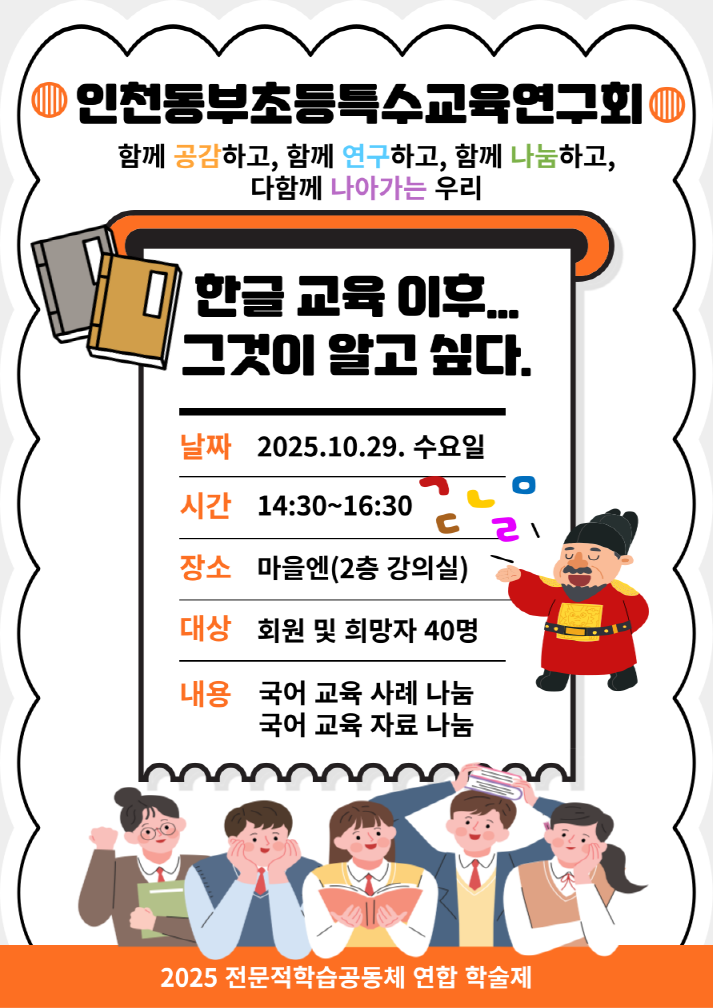 주제연구형 특수교육 연수구 한글 교육 이후 그것이 알고 싶다. 공동체명인천동부초등특수교육연구회 일시2025년 10월 29일 14:30 - 16:30 장소마을엔 2층 강의실 좌석17석 / 40석 나눔방법공개연수(대면) 담당자인천한빛초 허정림 신청기간 마감 목록보기
