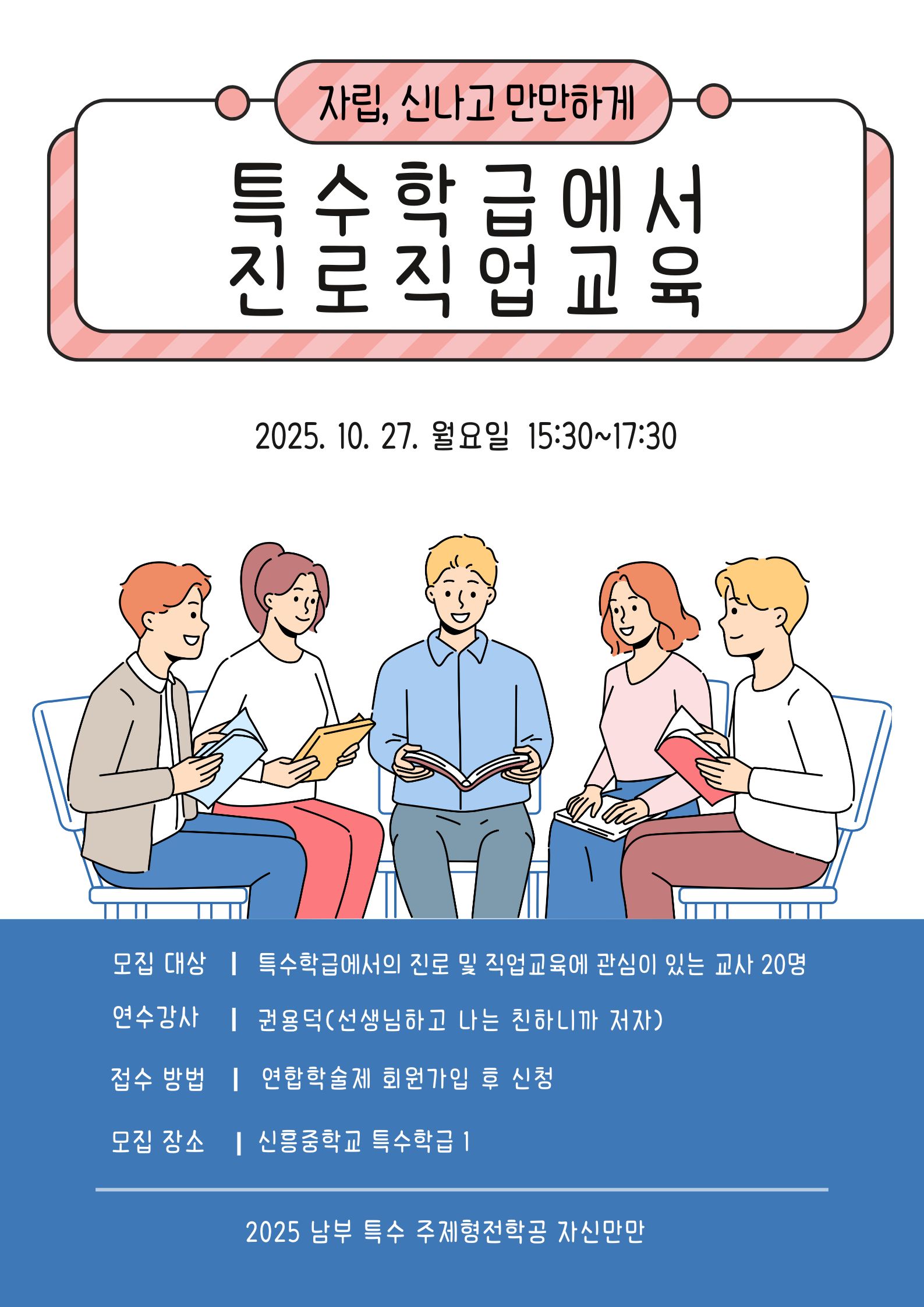 주제연구형 특수교육 중구 특수교육대상학생의 진로와 직업 수업 방안 공동체명자신만만 일시2025년 10월 27일 15:30 - 17:30 장소신흥중학교 특수학급1 좌석8석 / 20석 나눔방법공개연수(대면) 담당자신흥중 지애리 신청기간 마감 목록보기