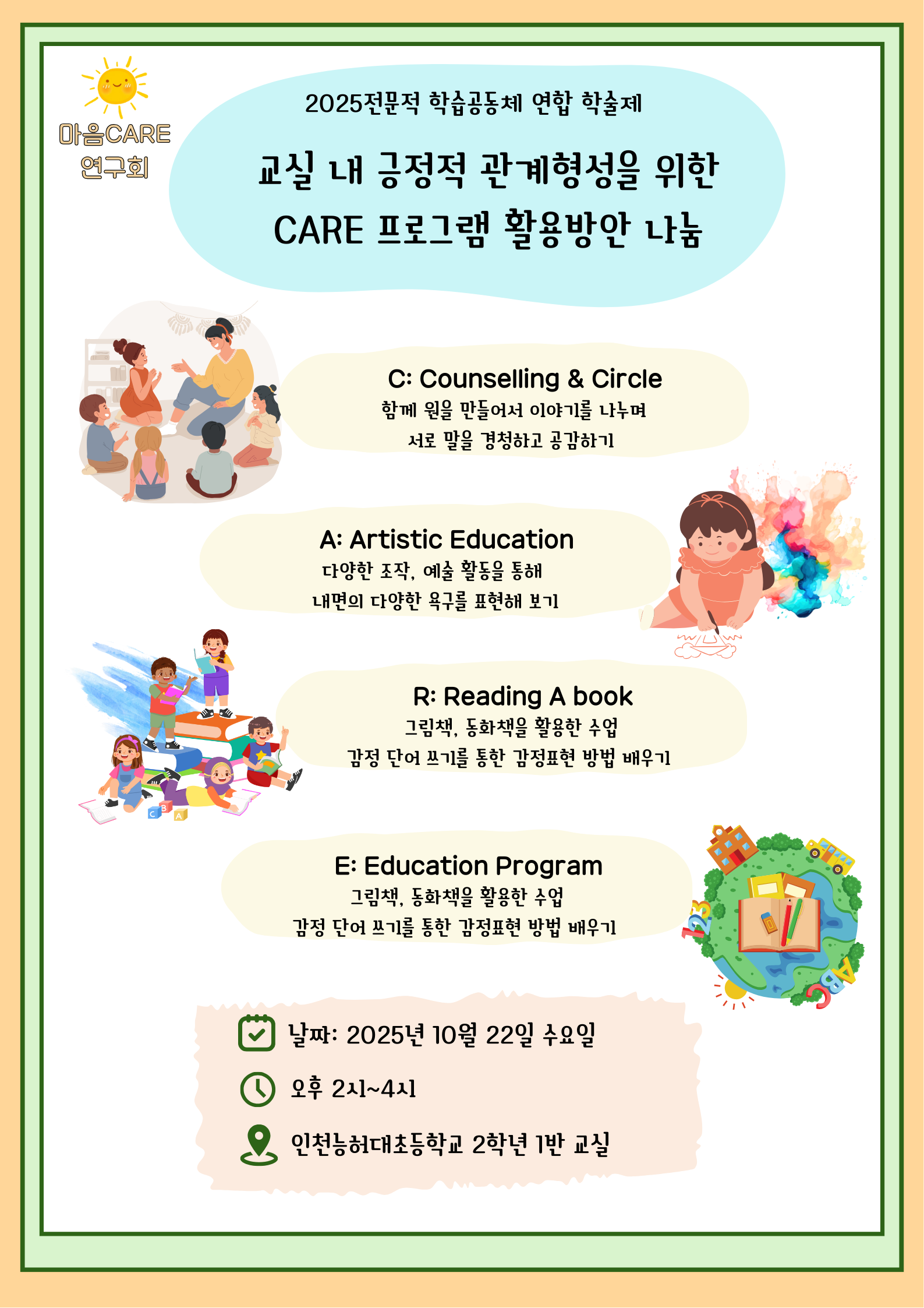 주제연구형 평화/생활교육 연수구 교실 내 긍정적 관계형성을 위한 CARE프로그램 활용방안 나눔 공동체명마음CARE연구회 일시2025년 10월 22일 14:00 - 16:00 장소인천능허대초 2-1교실 좌석9석 / 15석 나눔방법워크숍(대면) 담당자인천능허대초 김선미 신청기간 마감 목록보기