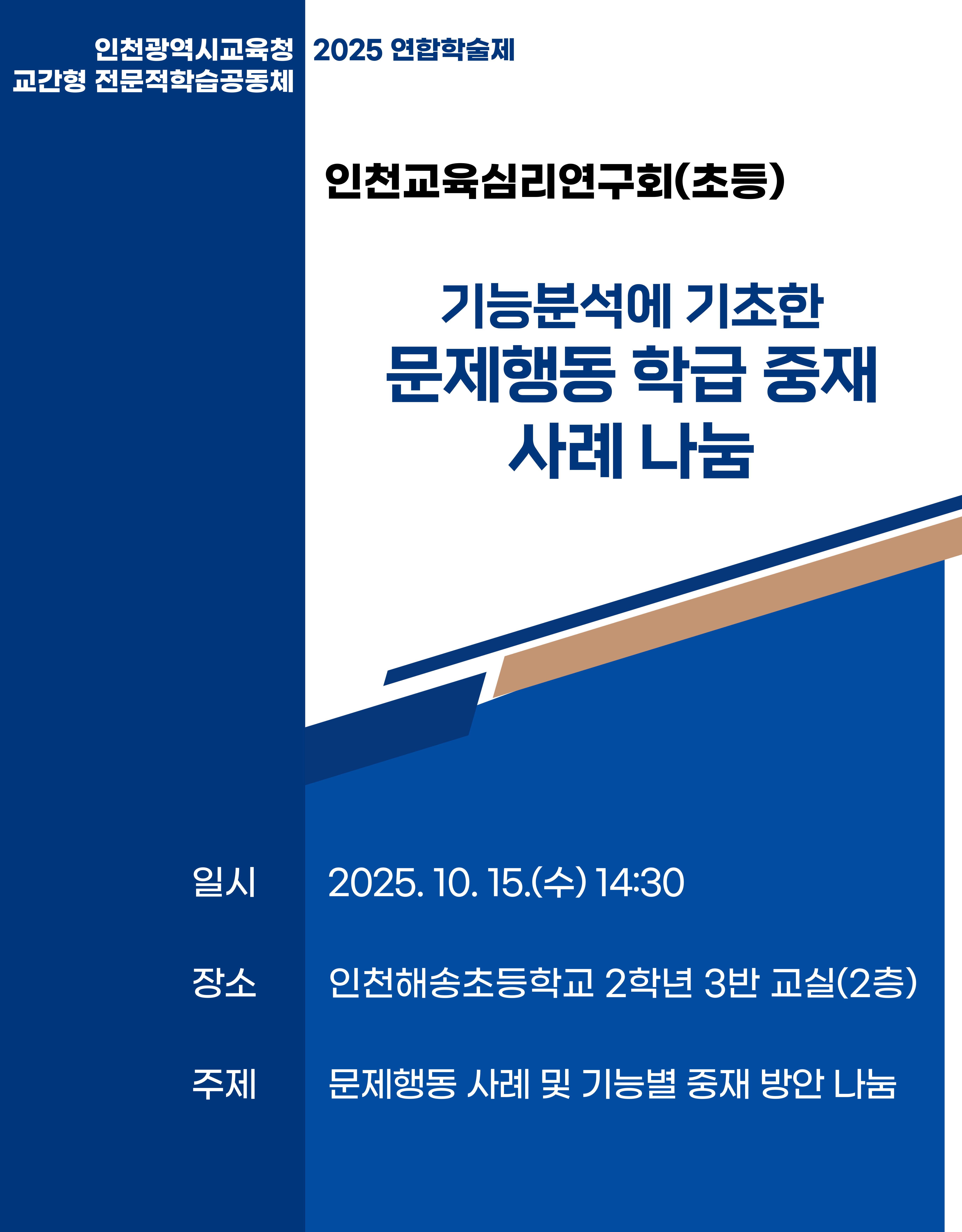 주제연구형 평화/생활교육 연수구 기능분석에 기초한 문제행동 학급중재 사례 나눔 공동체명인천교육심리연구회(초등) 일시2025년 10월 15일 14:30 - 16:30 장소인천해송초 2-3교실 좌석5석 / 24석 나눔방법워크숍(대면) 담당자인천해송초 송수원 신청기간 마감 목록보기