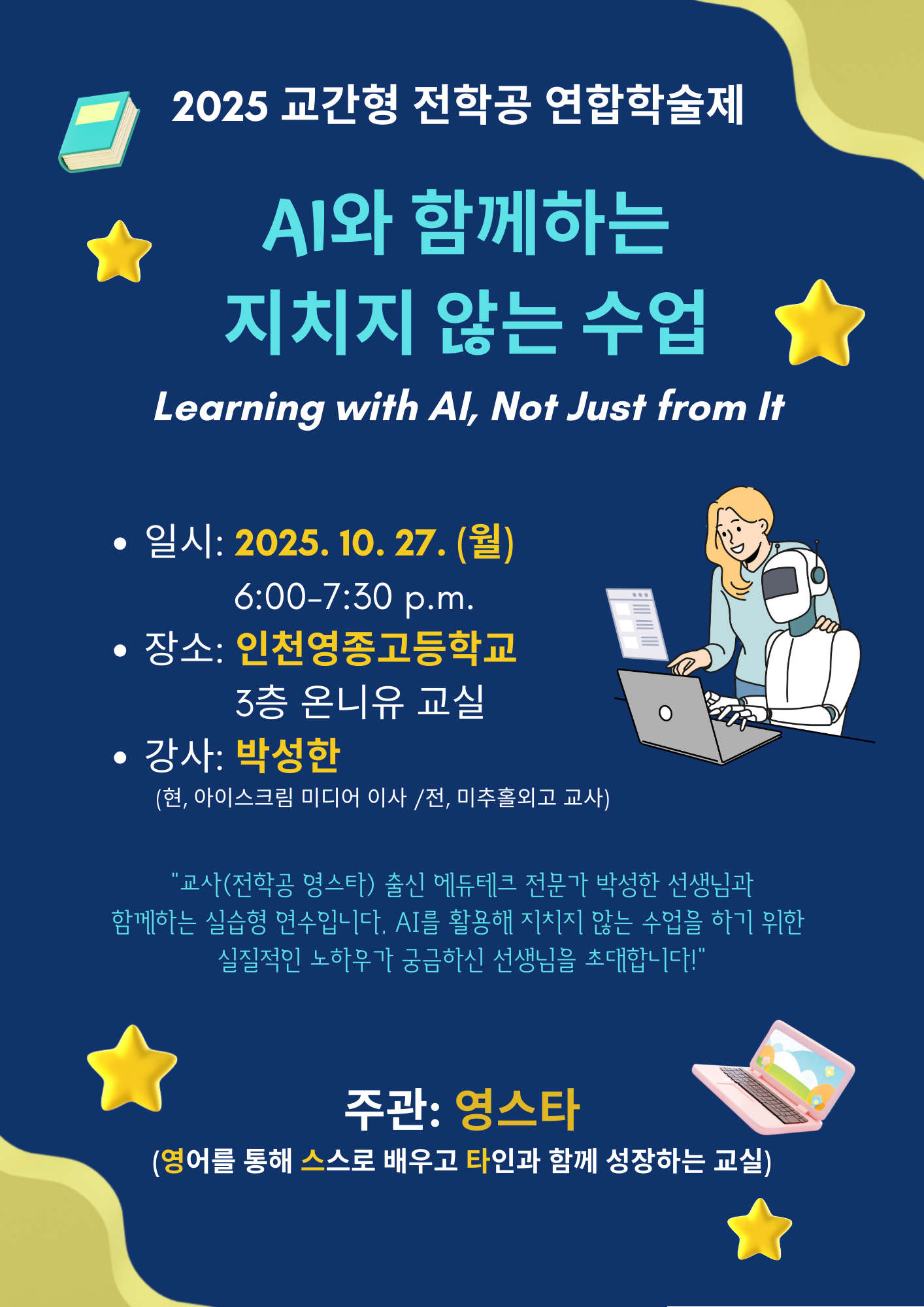 교과교육연구(회)형 AI・디지털교육/에듀테크 중구 AI와 함께하는 지치지 않는 수업 공동체명영스타(영어를 통해 스스로 배우고 타인과 함께 성장하는 교실) 일시2025년 10월 27일 18:00 - 19:30 장소인천영종고 OnlyYou(온니유) 교실 좌석11석 / 15석 나눔방법공개연수(대면) 담당자인천영종고 홍경아 신청기간 마감 목록보기
