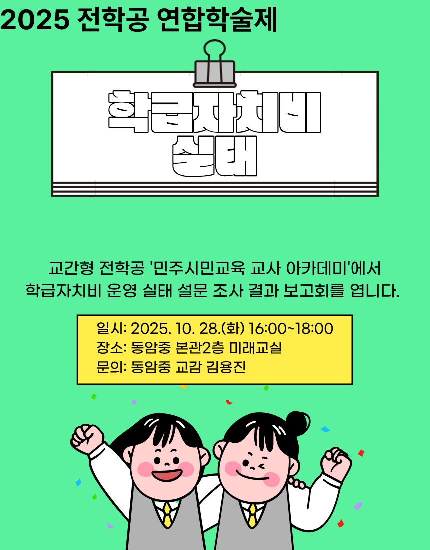 주제연구형 기타 부평구 학급자치비 운영 실태 및 발전방향 공동체명2025민교아카데미 일시2025년 10월 28일 16:00 - 18:00 장소동암중 본관 2층 미래교실 좌석7석 / 40석 나눔방법워크숍(대면) 담당자동암중 김용진 신청기간 마감 목록보기