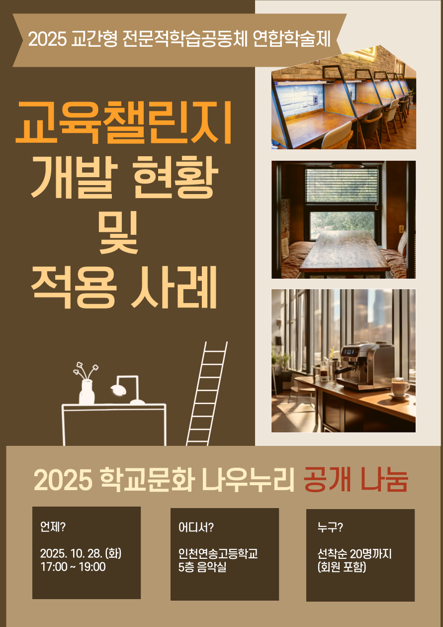 주제연구형 기타 연수구 교육챌린지 개발 현황 및 적용 사례 공동체명학교문화나우누리 일시2025년 10월 28일 17:00 - 19:00 장소인천연송고 5층 음악실 좌석9석 / 20석 나눔방법워크숍(대면) 담당자인천연송고 안은미 신청기간 마감 목록보기