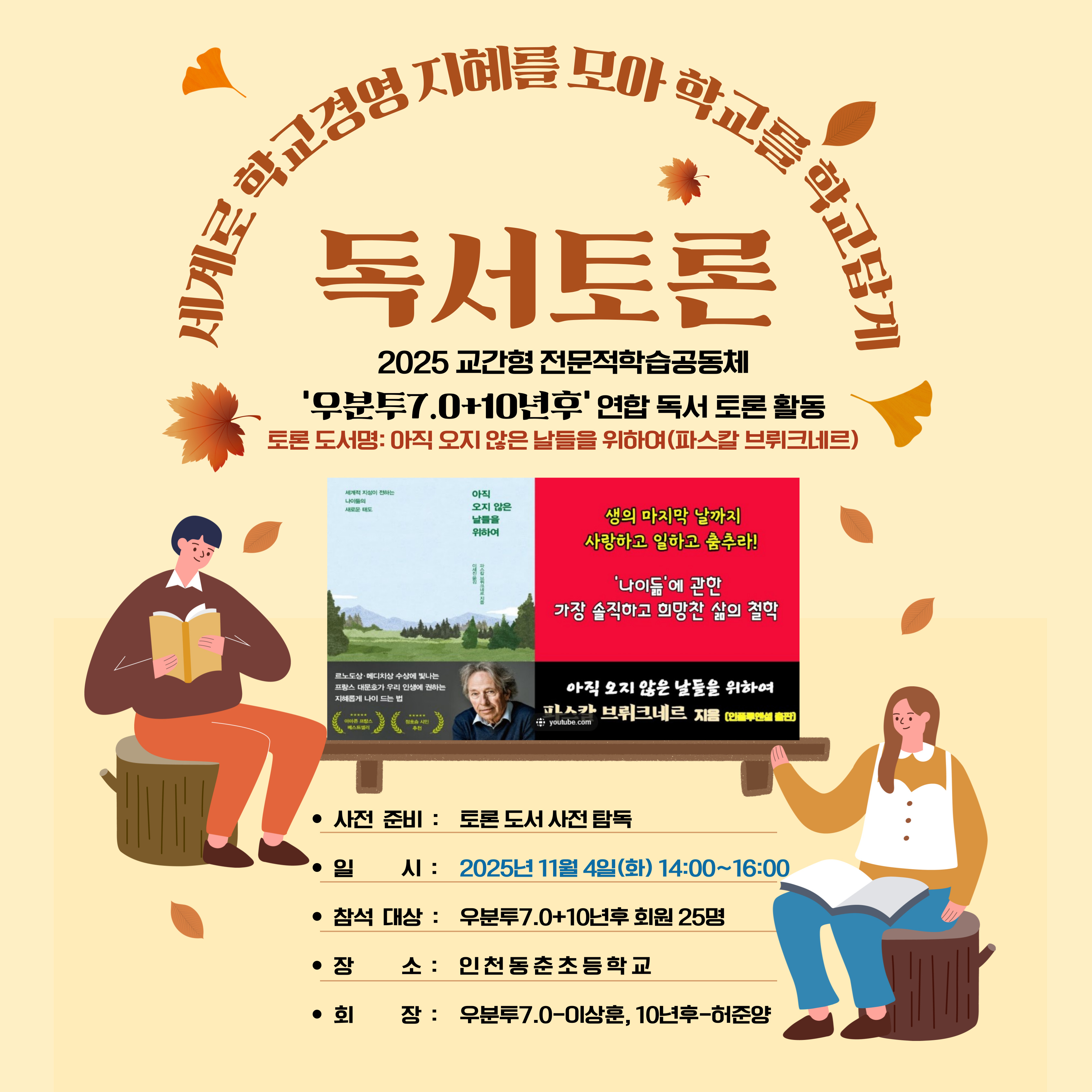 연합팀 기타 연수구 "삶의 지혜를 모으는 시간 -아직 오지 않은 날들을 위하여" 공동체명[10년후], [우분투 7.0] 일시2025년 11월 04일 14:00 - 16:00 장소인천동춘초등학교 2층 영어교육실 좌석22석 / 40석 나눔방법워크숍(대면) 담당자부평초 정봉남 신청기간 마감 목록보기