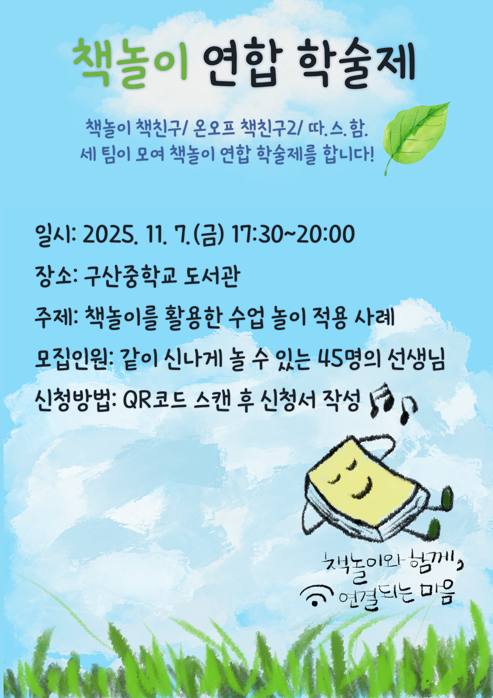 연합팀 국어/독서교육 부평구 책놀이를 활용한 수업놀이 적용 사례 나눔 공동체명읽걷쓰 기반 수업놀이연구회 [따스함], 온오프 책친구2, 책놀이 책친구 일시2025년 11월 07일 17:30 - 20:00 장소구산중 도서관 좌석39석 / 45석 나눔방법워크숍(대면) 담당자인천효성고 오향옥 신청기간 마감 목록보기